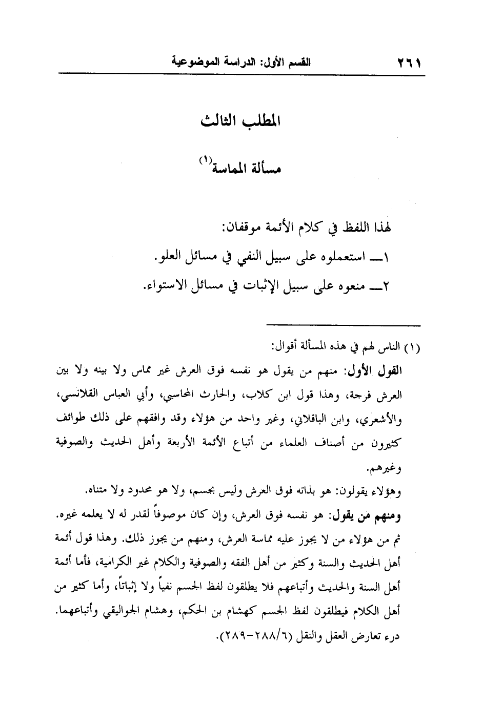 ومنهم من يقول: هو نفسه فوق العرش، وإن كان موصوفاً لقدر له لا يعلمه غيره. ثم من هؤلاء من لا يجوز عليه مماسة العرش، ومنهم من يجوز ذلك. وهذا قول أئمة أهل الحديث والسنة وكثير من أهل الفقه والصوفية والكلام غير الكرامية، فأما أئمة أهل السنة والحديث وأتباعهم فلا يطلقون لفظ الجسم نفياً ولا إثباتاً، وأما كثير من أهل الكلام فيطلقون لفظ الجسم كهشام بن الحكم، وهشام الجواليقي وأتباعهما. درء تعارض العقل والنقل (6/288-289) .