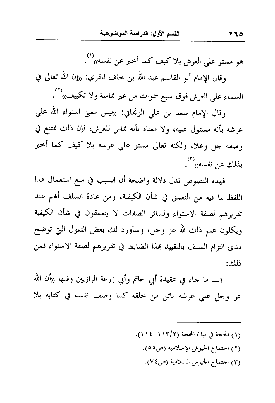 وقال الإمام سعد بن علي الزنجاني: "ليس معنى استواء الله على عرشه بأنه مستول عليه، ولا معناه بأنه مماس للعرش، فإن ذلك ممتنع في وصفه جل وعلا، ولكنه تعالى مستو على عرشه بلا كيف كما أخبر بذلك عن نفسه"3.