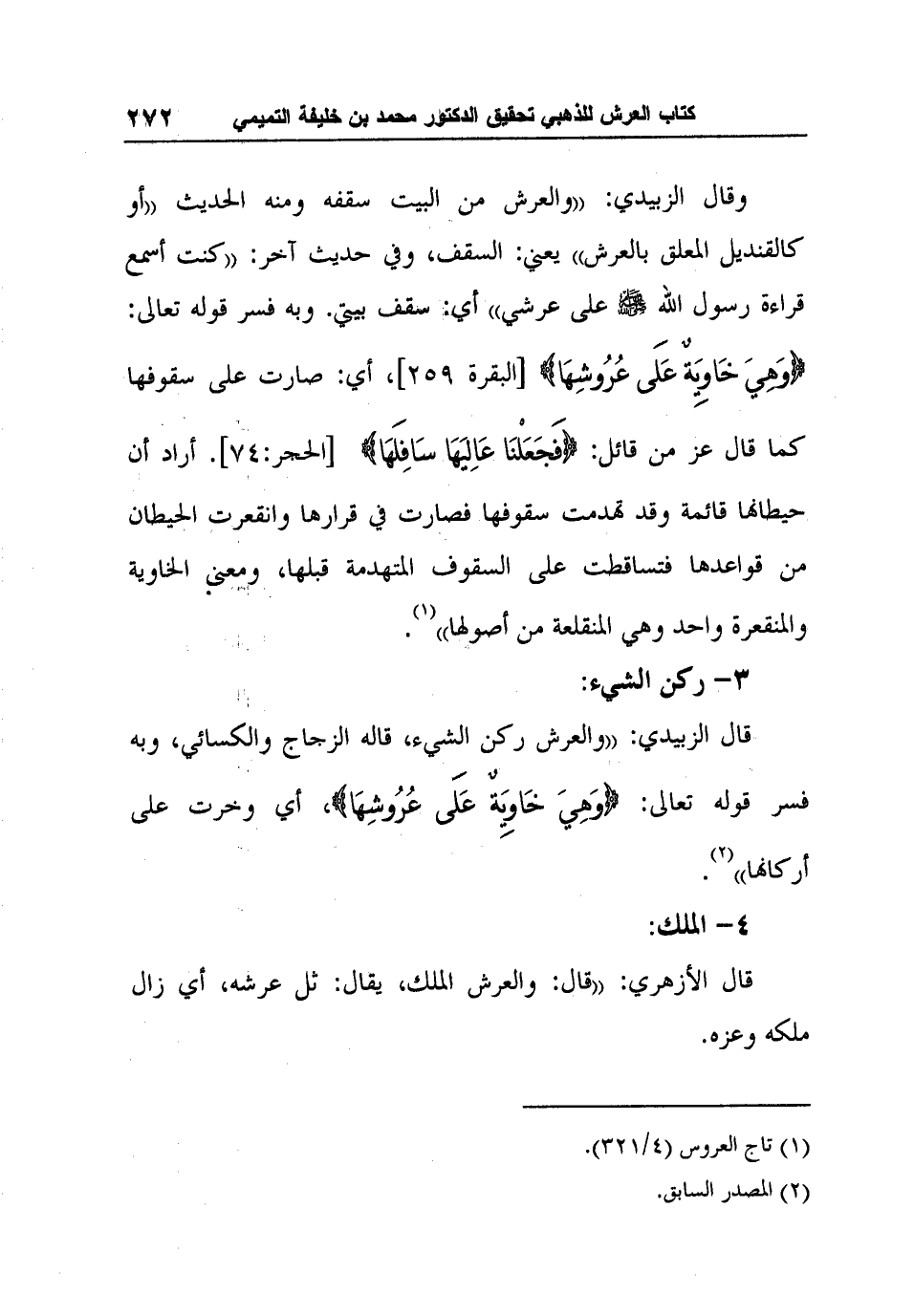 قال الزبيدي: "والعرش ركن الشيء، قاله الزجاج والكسائي، وبه فسر قوله تعالى: {وَهِيَ خَاوِيَةٌ عَلَى عُرُوشِهَا} ، أي وخرت على أركانها"2.