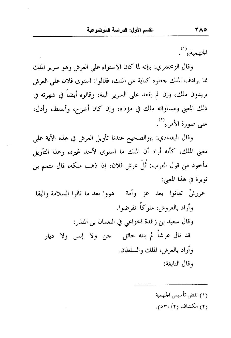 وقال البغدادي: "والصحيح عندنا تأويل العرش في هذه الآية على معنى الملك، كأنه أراد أن الملك ما استوى لأحد غيره، وهذا التأويل مأخوذ من قول العرب: ثُلَ عرش فلان، إذا ذهب ملكه، قال متمم بن نويرة في هذا المعنى: