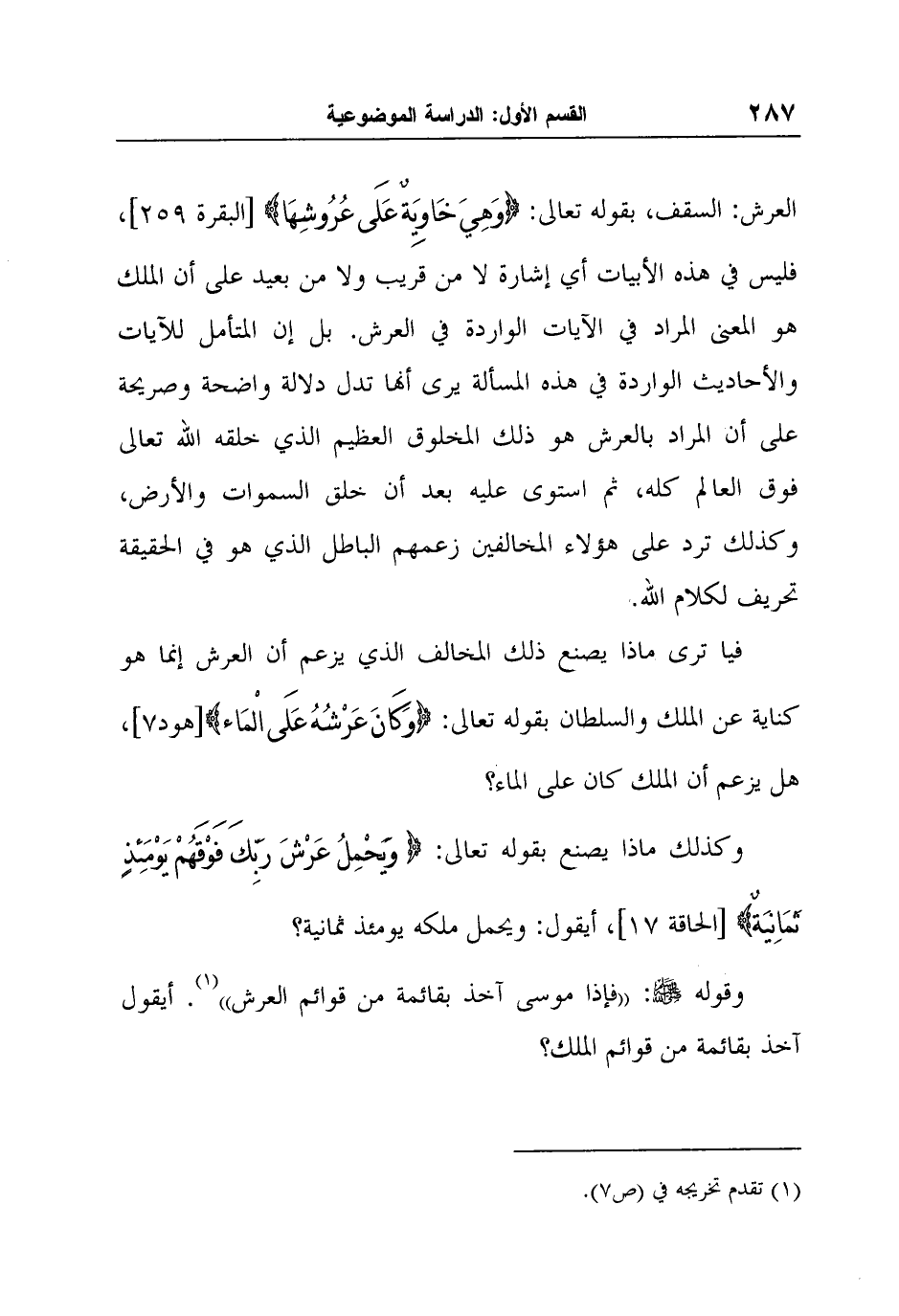 العرش: السقف، بقوله تعالى: {َهِيَ خَاوِيَةٌ عَلَى عُرُوشِهَا} [البقرة 259] ، فليس في هذه الأبيات أي إشارة لا من قريب ولا من بعيد على أن الملك هو المعنى المراد في الآيات الواردة في العرش. بل إن المتأمل للآيات والأحاديث الواردة في هذه المسألة يرى أنها تدل دلالة واضحة وصريحة على أن المراد بالعرش هو ذلك المخلوق العظيم الذي خلقه الله تعالى فوق العالم كله، ثم استوى عليه بعد أن خلق السموات والأرض، وكذلك ترد على هؤلاء المخالفين زعمهم الباطل الذي هو في الحقيقة تحريف لكلام الله.