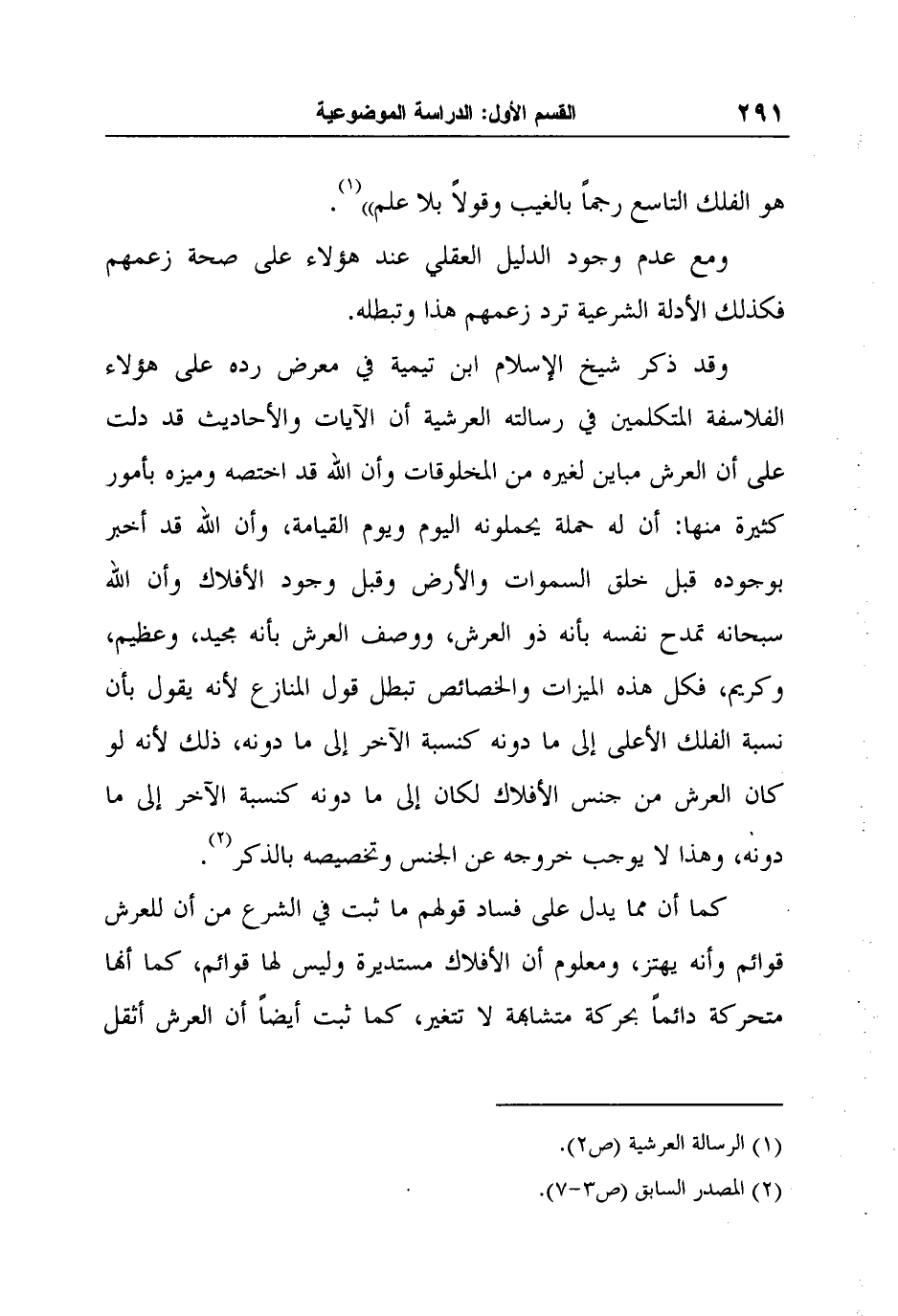 وقد ذكر شيخ الإسلام ابن تيمية في معرض رده على هؤلاء الفلاسفة المتكلمين في رسالته العرشية أن الآيات والأحاديث قد دلت على أن العرش مباين لغيره من المخلوقات وأن الله قد اختصه وميزه بأمور كثيرة منها: أن له حملة يحملونه اليوم ويوم القيامة، وأن الله قد أخبر بوجوده قبل خلق السموات والأرض وقبل وجود الأفلاك وأن الله سبحانه تمدح نفسه بأنه ذو العرش، ووصف العرش بأنه مجيد، وعظيم، وكريم، فكل هذه الميزات والخصائص تبطل قول المنازع لأنه يقول بأن نسبة الفلك الأعلى إلى ما دونه كنسبة الآخر إلى ما دونه، ذلك لأنه لو كان العرش من جنس الأفلاك لكان إلى ما دونه كنسبة الآخر إلى ما دونه، وهذا لا يوجب خروجه عن الجنس وتخصيصه بالذكر2.