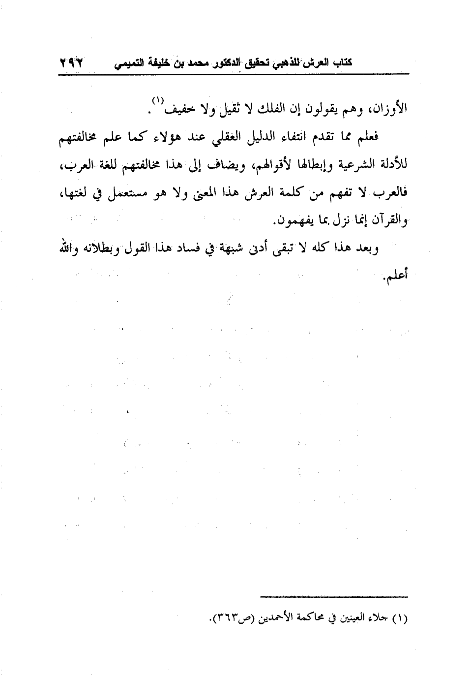 فعلم مما تقدم انتفاء الدليل العقلي عند هؤلاء كما علم مخالفتهم للأدلة الشرعية وإبطالها لأقوالهم، ويضاف إلى هذا مخالفتهم للغة العرب، فالعرب لا تفهم من كلمة العرش هذا المعنى ولا هو مستعمل في لغتها، والقرآن إنما نزل بما يفهمون.