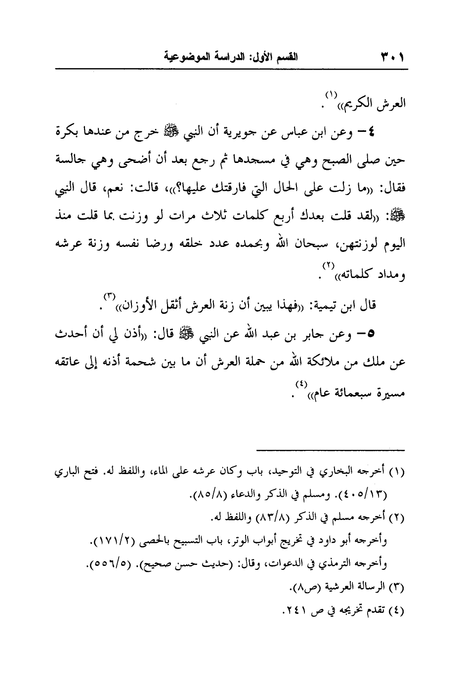 4- وعن ابن عباس عن جويرية أن النبي صلى الله عليه وسلم خرج من عندها بكرة حين صلى الصبح وهي في مسجدها ثم رجع بعد أن أضحى وهي جالسة فقال: "ما زلت على الحال التي فارقتك عليها؟ "، قالت: نعم، قال النبي صلى الله عليه وسلم: "لقد قلت بعدك أربع كلمات ثلاث مرات لو وزنت بما قلت منذ اليوم لوزنتهن، سبحان الله وبحمده عدد خلقه ورضا نفسه وزنة عرشه ومداد كلماته"2.