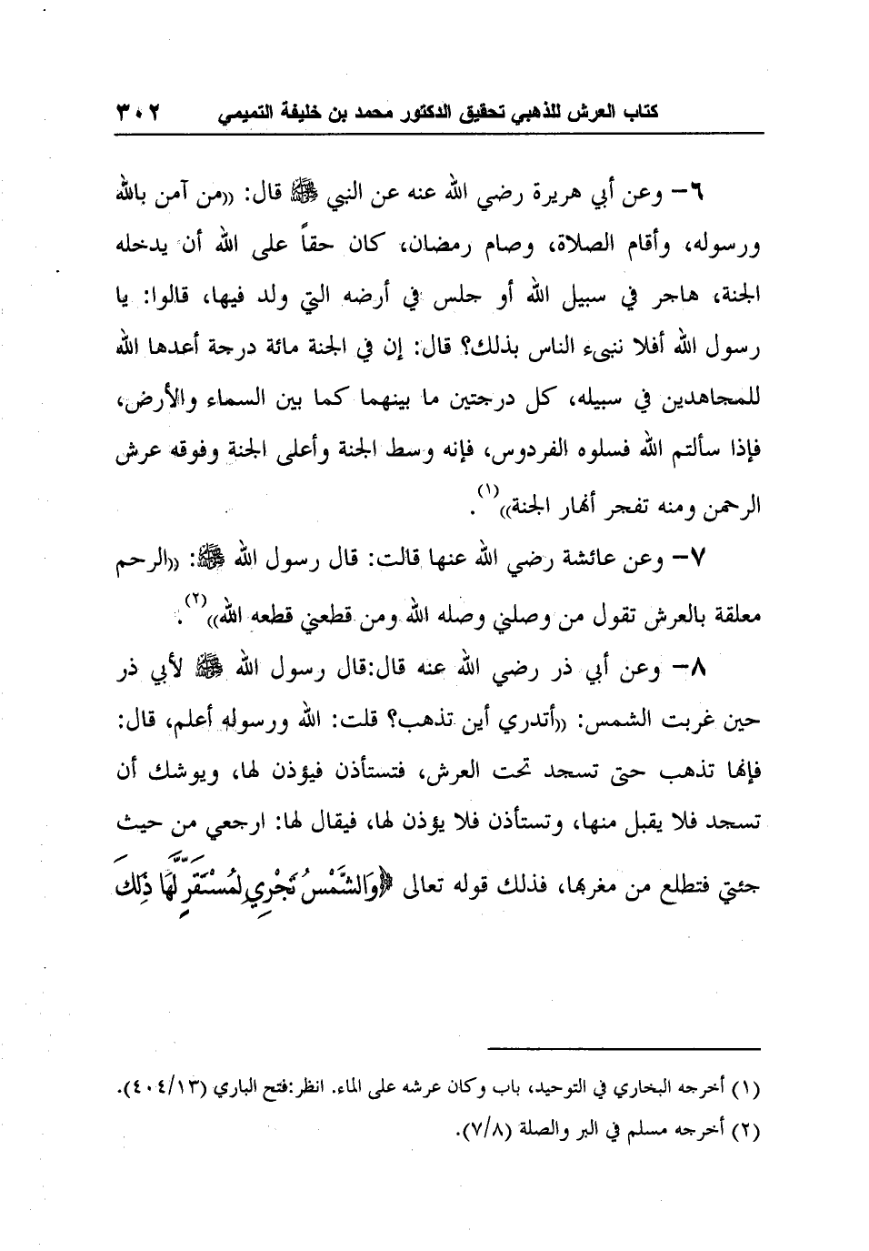 6- وعن أبي هريرة رضي الله عنه عن النبي صلى الله عليه وسلم قال: "من آمن بالله ورسوله، وأقام الصلاة، وصام رمضان، كان حقاً على الله أن يدخله الجنة، هاجر في سبيل الله أو جلس في أرضه التي ولد فيها، قالوا: يا رسول الله أفلا ننبىء الناس بذلك؟ قال: إن في الجنة مائة درجة أعدها الله للمجاهدين في سبيله، كل درجتين ما بينهما كما بين السماء والأرض، فإذا سألتم الله فسلوه الفردوس، فإنه وسط الجنة وأعلى الجنة وفوقه عرش الرحمن ومنه تفجر أنهار الجنة"1.