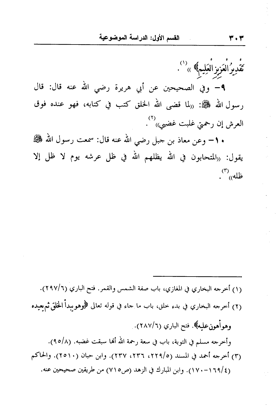 9- وفي الصحيحين عن أبي هريرة رضي الله عنه قال: قال رسول الله صلى الله عليه وسلم: "لما قضى الله الخلق كتب في كتابه، فهو عنده فوق العرش إن رحمتي غلبت غضبي"2.