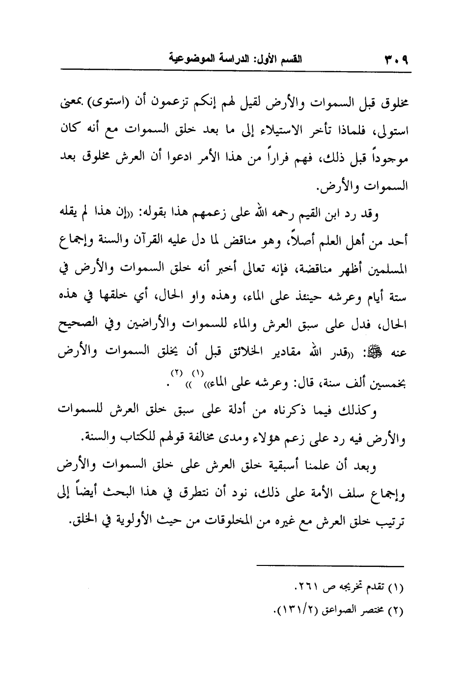 وقد رد ابن القيم رحمه الله على زعمهم هذا بقوله: "إن هذا لم يقله أحد من أهل العلم أصلاً، وهو مناقض لما دل عليه القرآن والسنة وإجماع المسلمين أظهر مناقضة، فإنه تعالى أخبر أنه خلق السموات والأرض في ستة أيام وعرشه حينئذ على الماء، وهذه واو الحال، أي خلقها في هذه الحال، فدل على سبق العرش والماء للسموات والأراضين وفي الصحيح عنه صلى الله عليه وسلم: "قدر الله مقادير الخلائق قبل أن يخلق السموات والأرض بخمسين ألف سنة، قال: وعرشه على الماء"1 2.