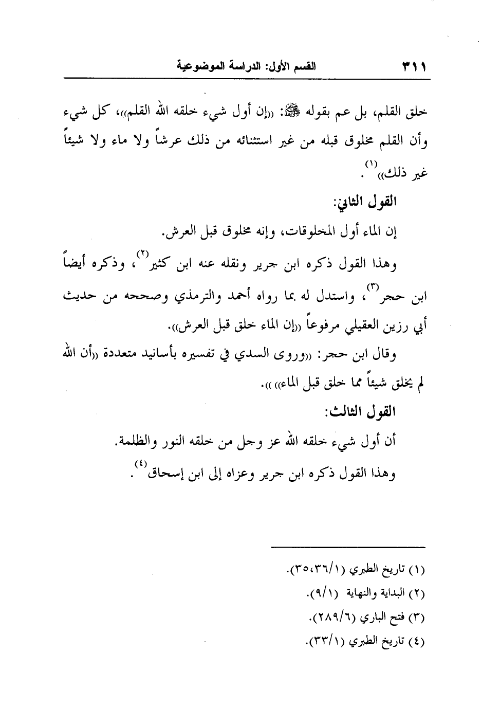خلق القلم، بل عم بقوله صلى الله عليه وسلم: "إن أول شيء خلقه الله القلم "، كل شيء وأن القلم مخلوق قبله من غير استثنائه من ذلك عرشاً ولا ماء ولا شيئاً غير ذلك"1.