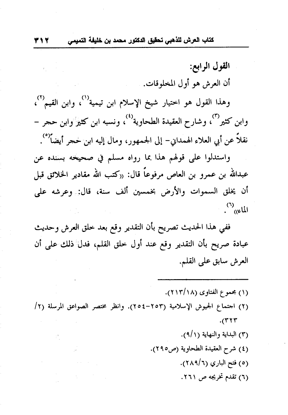 واستدلوا على قولهم هذا بما رواه مسلم في صحيحه بسنده عن عبد الله بن عمرو بن العاص مرفوعاً قال: "كتب الله مقادير الخلائق قبل أن يخلق السموات والأرض بخمسين ألف سنة، قال: وعرشه على الماء"6.