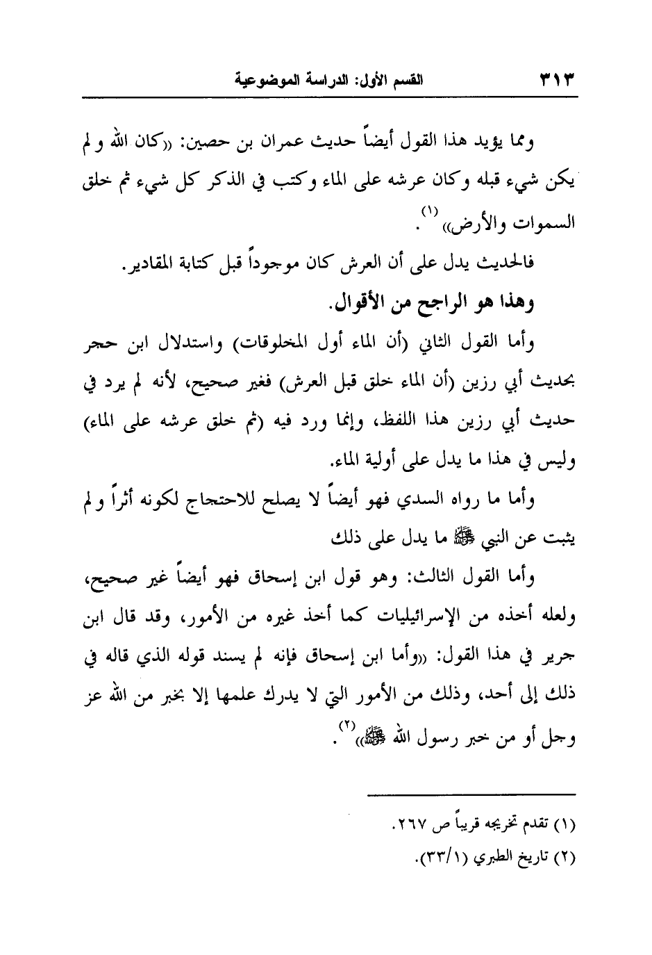 ومما يؤيد هذا القول أيضاً حديث عمران بن حصين: "كان الله ولم يكن شيء قبله وكان عرشه على الماء وكتب في الذكر كل شيء ثم خلق السموات والأرض" 1.