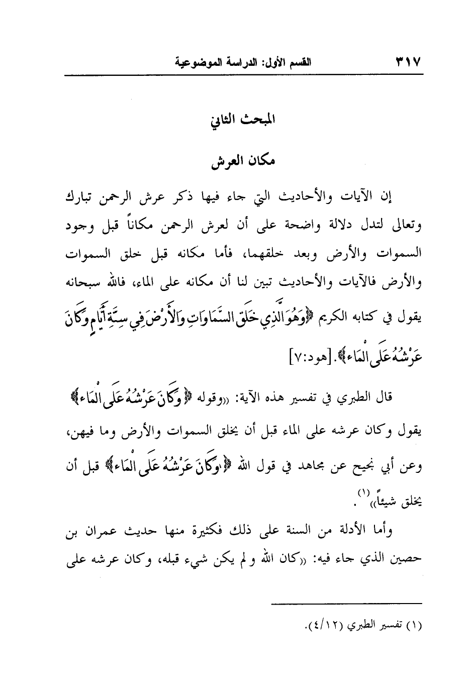 قال الطبري في تفسير هذه الآية: "وقوله {وَكَانَ عَرْشُهُ عَلَى الْمَاء} يقول وكان عرشه على الماء قبل أن يخلق السموات والأرض وما فيهن، وعن أبي نجيح عن مجاهد في قول الله {وَكَانَ عَرْشُهُ عَلَى الْمَاء} قبل أن يخلق شيئاً"1.