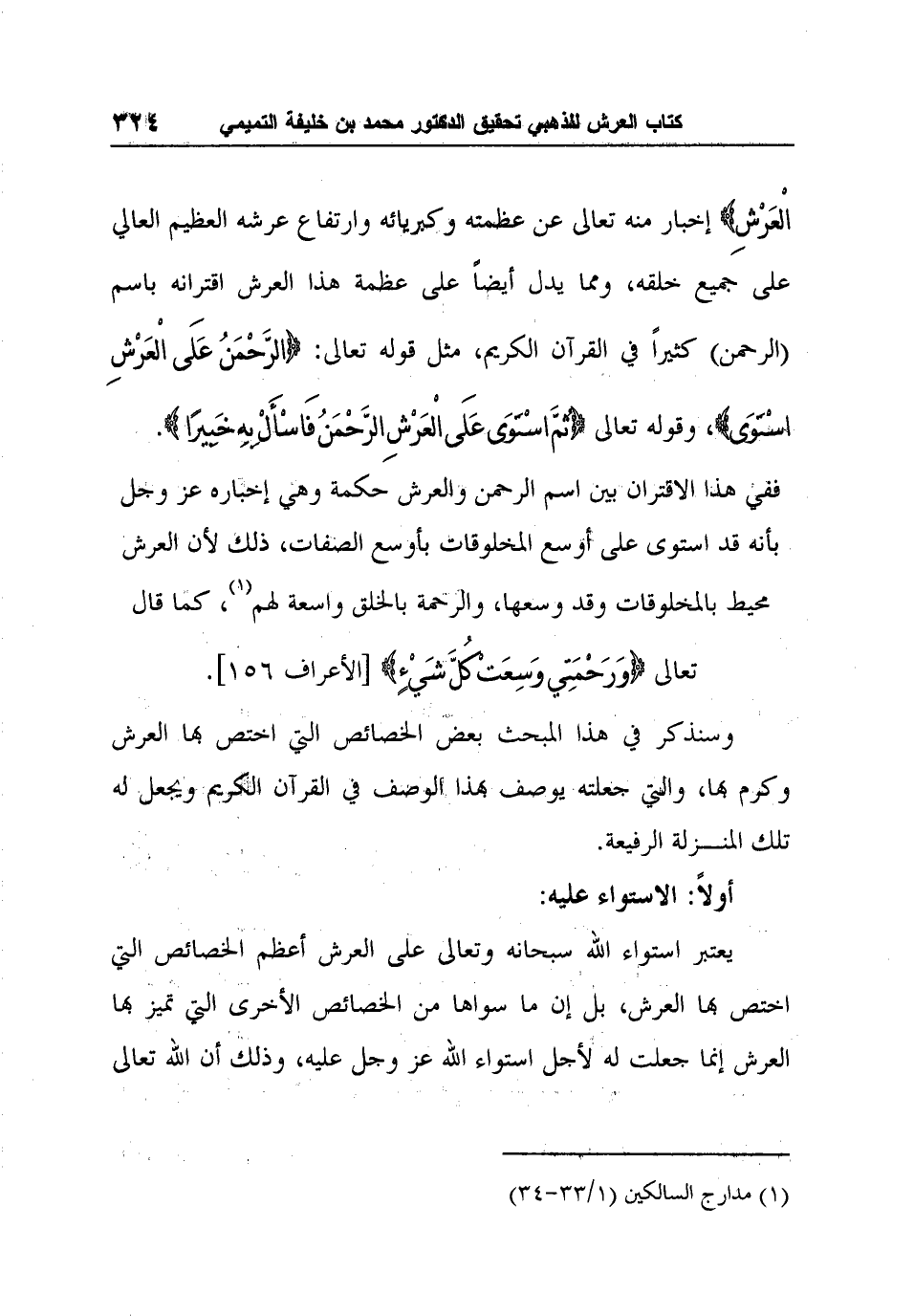 الْعَرْشِ} إخبار منه تعالى عن عظمته وكبريائه وارتفاع عرشه العظيم العالي على جميع خلقه، ومما يدل أيضاً على عظمة هذا العرش اقترانه باسم (الرحمن) كثيراً في القرآن الكريم، مثل قوله تعالى: {الرَّحْمَنُ عَلَى الْعَرْشِ اسْتَوَى} ، وقوله تعالى {ثُمَّ اسْتَوَى عَلَى الْعَرْشِ الرَّحْمَنُ فَاسْأَلْ بِهِ خَبِيرًا} .