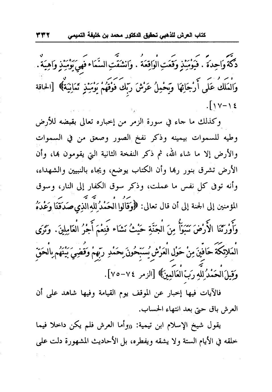 وكذلك ما جاء في سورة الزمر من إخباره تعالى بقبضه للأرض وطيه للسموات بيمينه وذكر نفخ الصور وصعق من في السموات والأرض إلا ما شاء الله، ثم ذكر النفخة الثانية التي يقومون بها، وأن الأرض تشرق بنور ربها وأن الكتاب يوضع، ويجاء بالنبيين والشهداء، وأنه توفى كل نفس ما عملت، وذكر سوق الكفار إلى النار، وسوق المؤمنين إلى الجنة إلى أن قال تعالى: {وَقَالُوا الْحَمْدُ لِلَّهِ الَّذِي صَدَقَنَا وَعْدَهُ وَأَوْرَثَنَا الأَرْضَ نَتَبَوَّأُ مِنَ الْجَنَّةِ حَيْثُ نَشَاء فَنِعْمَ أَجْرُ الْعَامِلِينَ. وَتَرَى الْمَلائِكَةَ حَافِّينَ مِنْ حَوْلِ الْعَرْشِ يُسَبِّحُونَ بِحَمْدِ رَبِّهِمْ وَقُضِيَ بَيْنَهُم بِالْحَقِّ وَقِيلَ الْحَمْدُ لِلَّهِ رَبِّ الْعَالَمِينَ} [الزمر 74-75] .