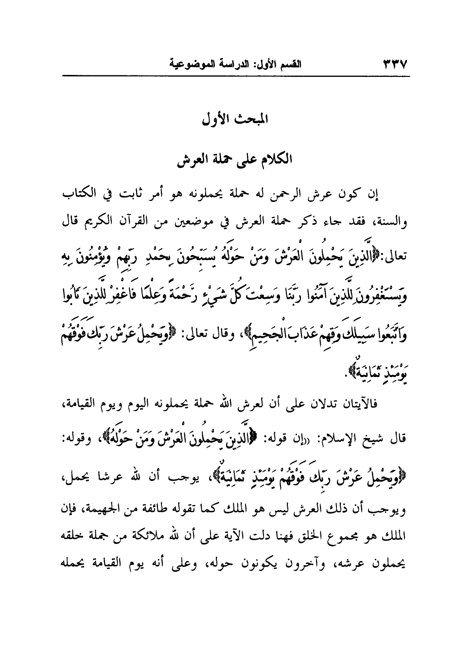 إن كون عرش الرحمن له حملة يحملونه هو أمر ثابت في الكتاب والسنة، فقد جاء ذكر حملة العرش في موضعين من القرآن الكريم قال تعالى: {الَّذِينَ يَحْمِلُونَ الْعَرْشَ وَمَنْ حَوْلَهُ يُسَبِّحُونَ بِحَمْدِ رَبِّهِمْ وَيُؤْمِنُونَ بِهِ وَيَسْتَغْفِرُونَ لِلَّذِينَ آمَنُوا رَبَّنَا وَسِعْتَ كُلَّ شَيْءٍ رَّحْمَةً وَعِلْمًا فَاغْفِرْ لِلَّذِينَ تَابُوا وَاتَّبَعُوا سَبِيلَكَ وَقِهِمْ عَذَابَ الْجَحِيمِ} ، وقال تعالى: {وَيَحْمِلُ عَرْشَ رَبِّكَ فَوْقَهُمْ يَوْمَئِذٍ ثَمَانِيَةٌ} .