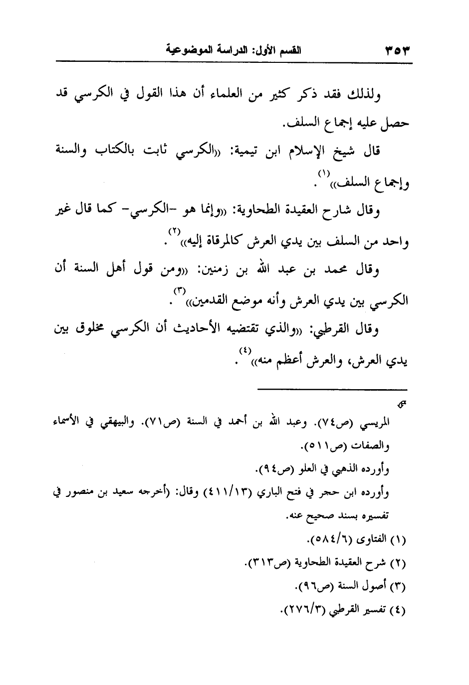 ولذلك فقد ذكر كثير من العلماء أن هذا القول في الكرسي قد حصل عليه إجماع السلف.