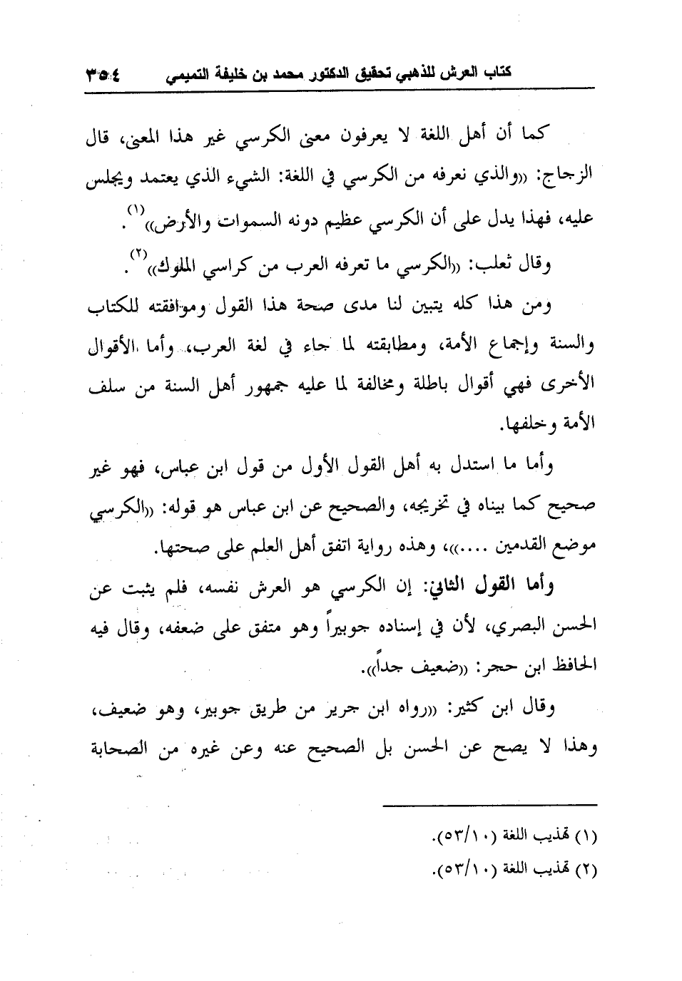 وأما القول الثاني: إن الكرسي هو العرش نفسه، فلم يثبت عن الحسن البصري، لأن في إسناده جوبيراً وهو متفق على ضعفه، وقال فيه الحافظ ابن حجر: "ضعيف جداً".