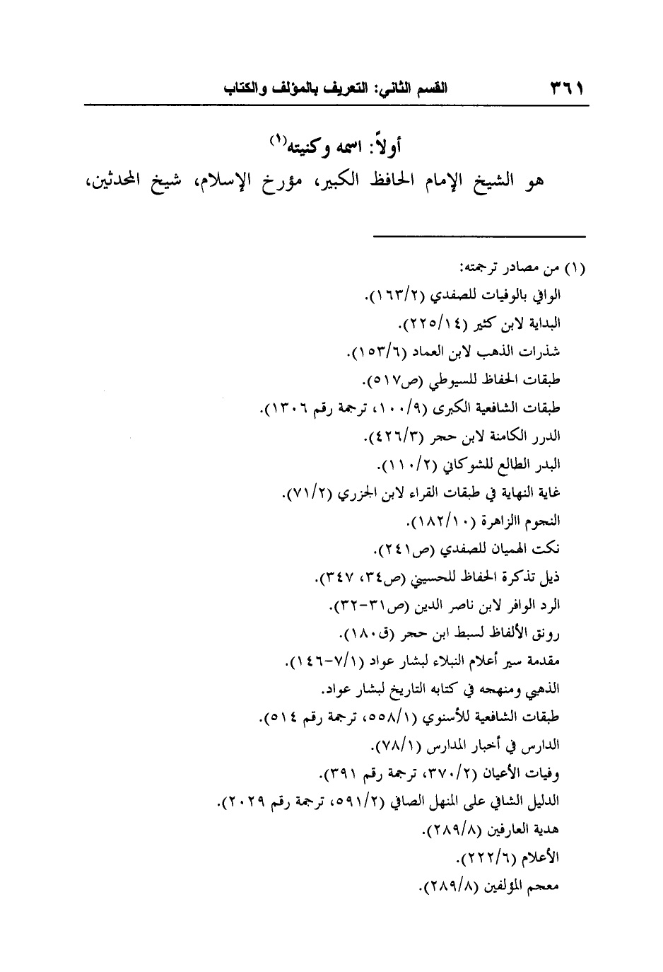 1 من مصادر ترجمته: الوافي بالوفيات للصفدي (2/163) .البداية لابن كثير (14/225) .شذرات الذهب لابن العماد (6/153) .طبقات الحفاظ للسيوطي (ص517) .طبقات الشافعية الكبرى (9/100، ترجمة رقم 1306) .الدرر الكامنة لابن حجر (3/426) .البدر الطالع للشوكاني (2/110) .غاية النهاية في طبقات القراء لابن الجزري (2/71) .النجوم االزاهرة (10/182) .نكت الهميان للصفدي (ص241) .ذيل تذكرة الحفاظ للحسيني (ص34، 347) .الرد الوافر لابن ناصر الدين (ص31-32) .رونق الألفاظ لسبط ابن حجر (ق180) .مقدمة سير أعلام النبلاء لبشار عواد (1/7-146) .الذهبي ومنهجه في كتابه التاريخ لبشار عواد.
