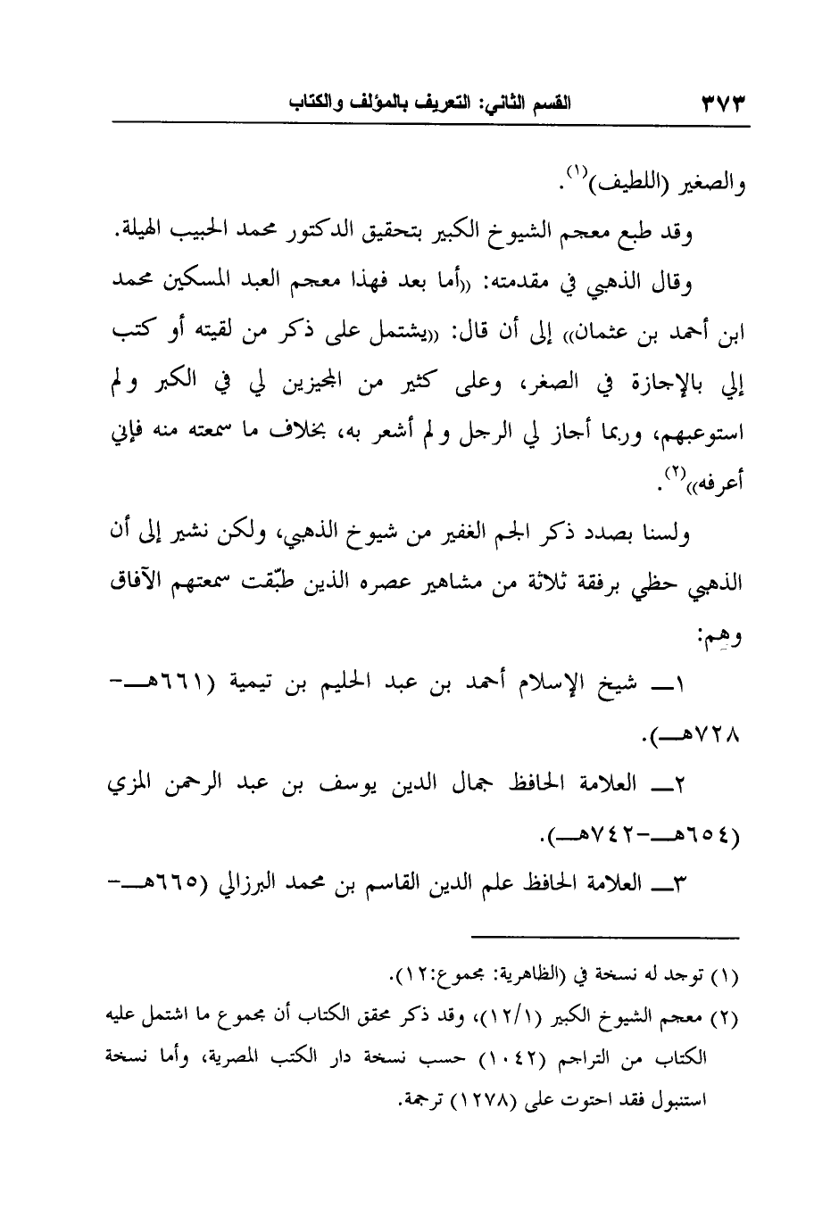 2 معجم الشيوخ الكبير (1/12) ، وقد ذكر محقق الكتاب أن مجموع ما اشتمل عليه الكتاب من التراجم (1042) حسب نسخة دار الكتب المصرية، وأما نسخة استنبول فقد احتوت على (1278) ترجمة.