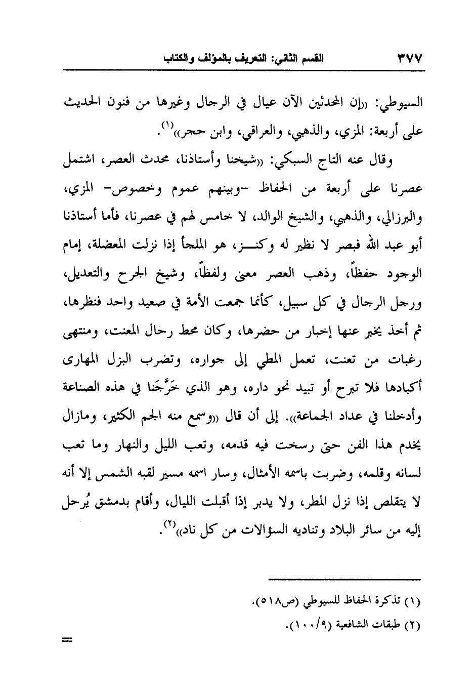 السيوطي: "إن المحدثين الآن عيال في الرجال وغيرها من فنون الحديث على أربعة: المزي، والذهبي، والعراقي، وابن حجر"1.