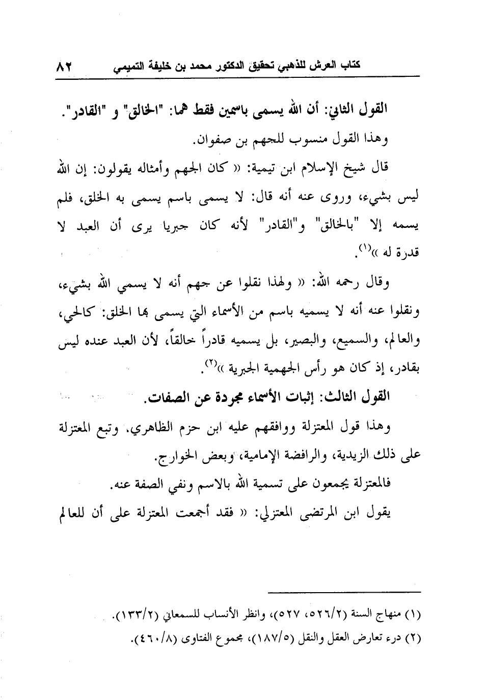 وقال رحمه الله: "ولهذا نقلوا عن جهم أنه لا يسمي الله بشيء، ونقلوا عنه أنه لا يسميه باسم من الأسماء التي يسمى بها الخلق: كالحي، والعالم، والسميع، والبصير، بل يسميه قادراً خالقاً، لأن العبد عنده ليس بقادر، إذ كان هو رأس الجهمية الجبرية "2.