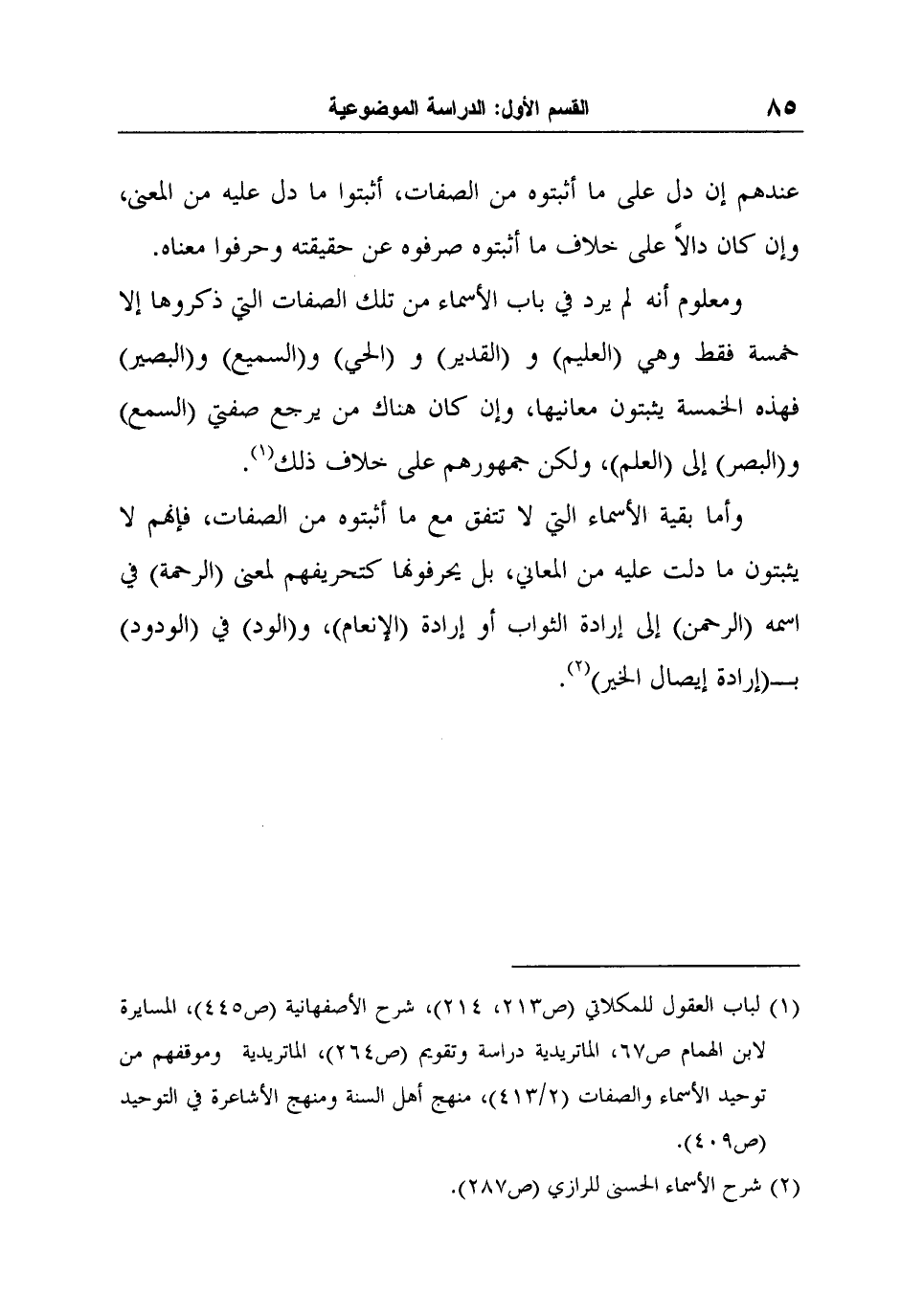 وأما بقية الأسماء التي لا تتفق مع ما أثبتوه من الصفات، فإنهم لا يثبتون ما دلت عليه من المعاني، بل يحرفونها كتحريفهم لمعنى (الرحمة) في اسمه (الرحمن) إلى إرادة الثواب أو إرادة (الإنعام) ، و (الود) في (الودود) بـ (إرادة إيصال الخير) 2.