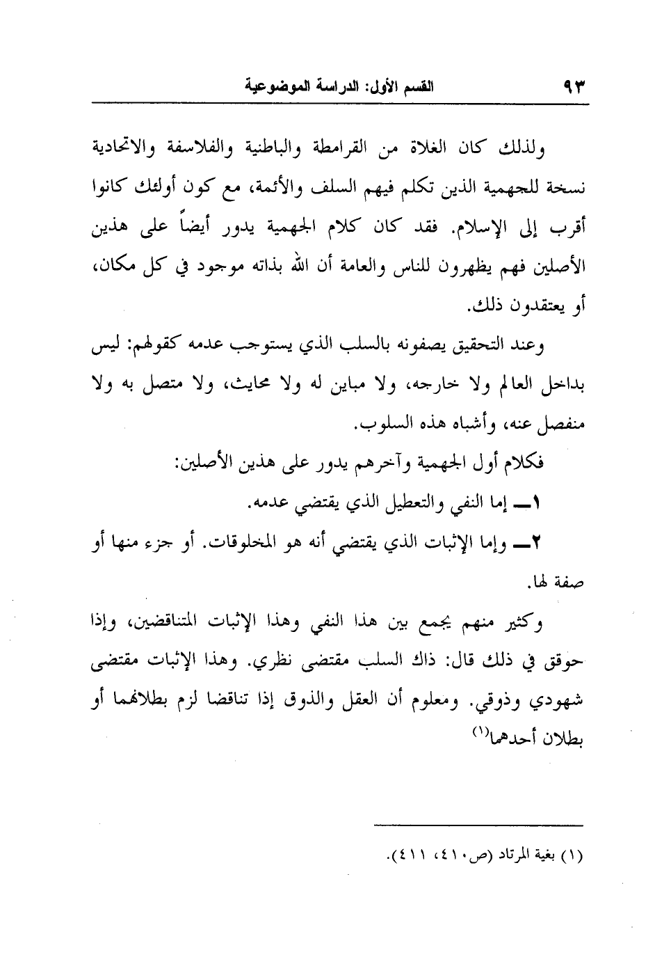 ولذلك كان الغلاة من القرامطة والباطنية والفلاسفة والاتحادية نسخة للجهمية الذين تكلم فيهم السلف والأئمة، مع كون أولئك كانوا أقرب إلى الإسلام. فقد كان كلام الجهمية يدور أيضاً على هذين الأصلين فهم يظهرون للناس والعامة أن الله بذاته موجود في كل مكان، أو يعتقدون ذلك.