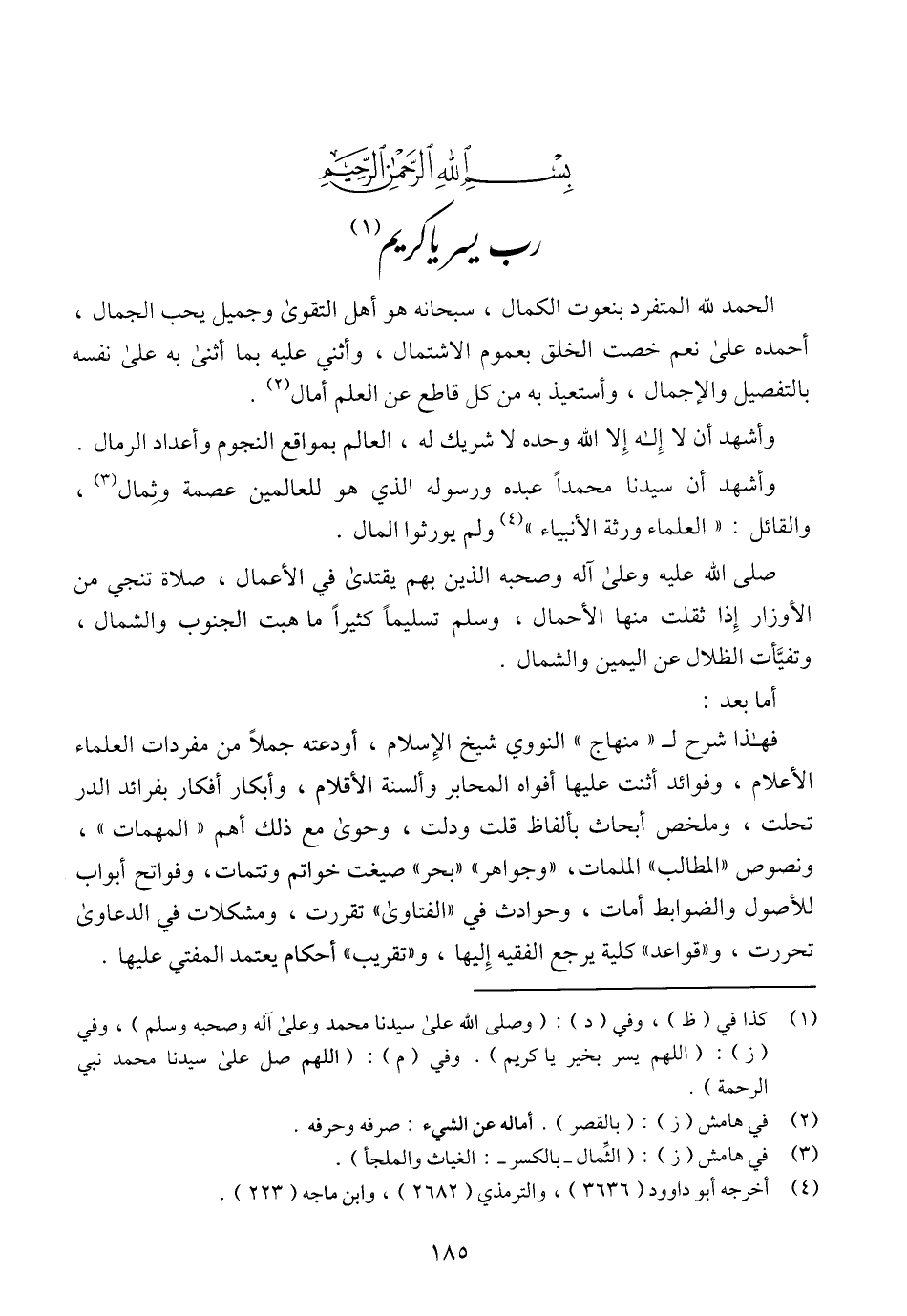 فهذا شرح لـ (منهاج) النووي شيخ الإسلام، أودعته جملاً من مفردات العلماء الأعلام، وفوائد أثنت عليها أفواه المحابر وألسنة الأقلام، وأبكار أفكار بفرائد الدر تحلت، وملخص أبحاث بألفاظ قلت ودلت، وحوى مع ذلك أهم (المهمات)، ونصوص (المطالب) الملمات، (وجواهر) (بحر) صيغت خواتم وتتمات، وفواتح أبواب للأصول والضوابط أمات، وحوادث في (الفتاوى) تقررت، ومشكلات في الدعاوى تحررت، و (قواعد) كلية يرجع الفقيه إليها، و (تقريب) أحكام يعتمد المفتي عليها.