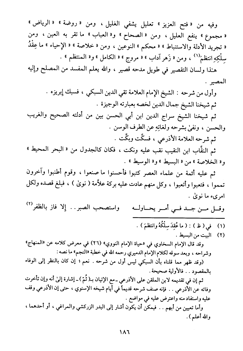 وفيه من (فتح العزيز) تعليل يشفي الغليل، ومن (روضة) (الرياض) (مجموع) ينفع العليل، ومن (الصحاح) و (العباب) ما تقر به العين، ومن (تجريد الأدلة والاستنباط) (محكم) النوعين، ومن (خلاصة) (الإحياء) ما عقد سلكنه انتظم، ومن (زهر آداب) (مروج) (الكامل) و (المنتظم).