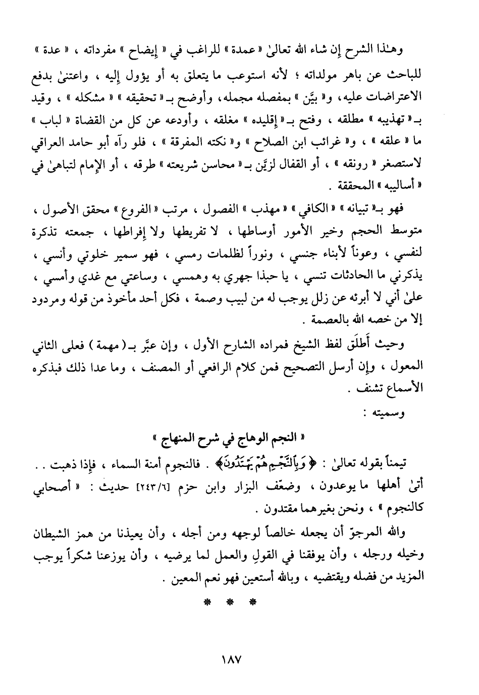 وهذا الشرح إن شاء الله تعالى (عمدة) للراغب في (إيضاح) مفرداته، (عدة) للباحث عن باهر مولداته؛ لأنه استوعب ما يتعلق به أو يؤول إليه، واعتنى بدفع الاعتراضات عليه، و (بين) بمفصله مجمله، وأوضح بـ (تحقيقه) (مشكله)، وقيد بـ (تهذيبه) مطلقه، وفتح بـ (إقليده) مغلقه، وأودعه عن كل من القضاة (لباب) ما (علقه)، و (غرائب ابن الصلاح) و (نكته المفرقة)، فلو رآه أبو حامد العراقي لاستصغر (رونقه)، أو القفال لزين بـ (محاسن شريعته) طرقه، أو الإمام لتباهي في (أساليبه) المحققة.