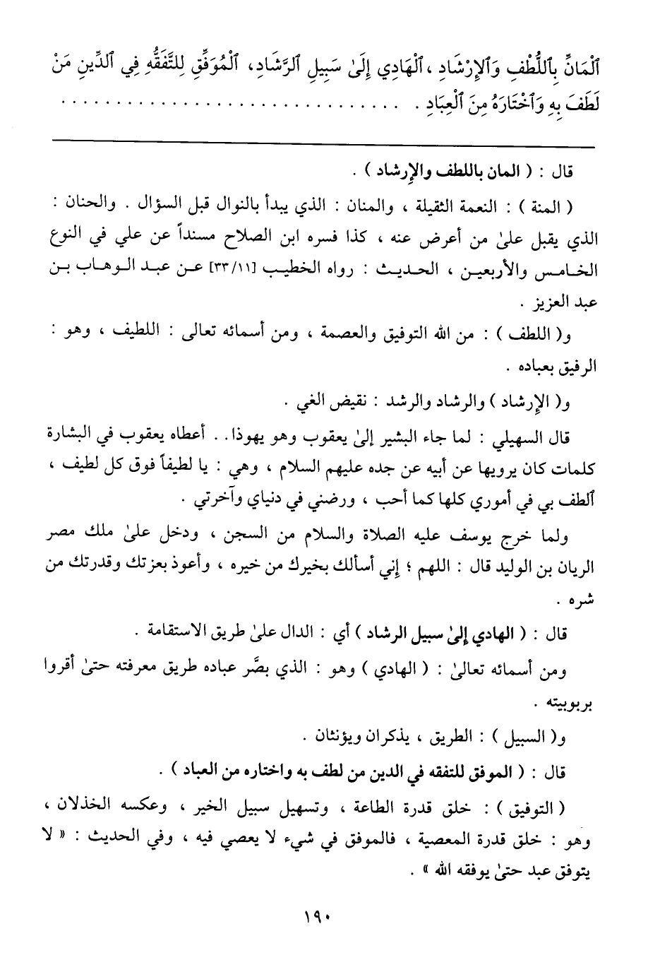 الْمَانَّ بِاللُّطْفِ وَالإِرْشَادِ، الْهَادِي إِلَى سَبِيلِ الرَّشَادِ، الْمُوَفَّقِ لِلتَّفَقُّهِ فِي الدَّينِ مَنْ لَطَفَ بِهِ وَاخْتَارَهُ مِنَ الْعِبَادِ