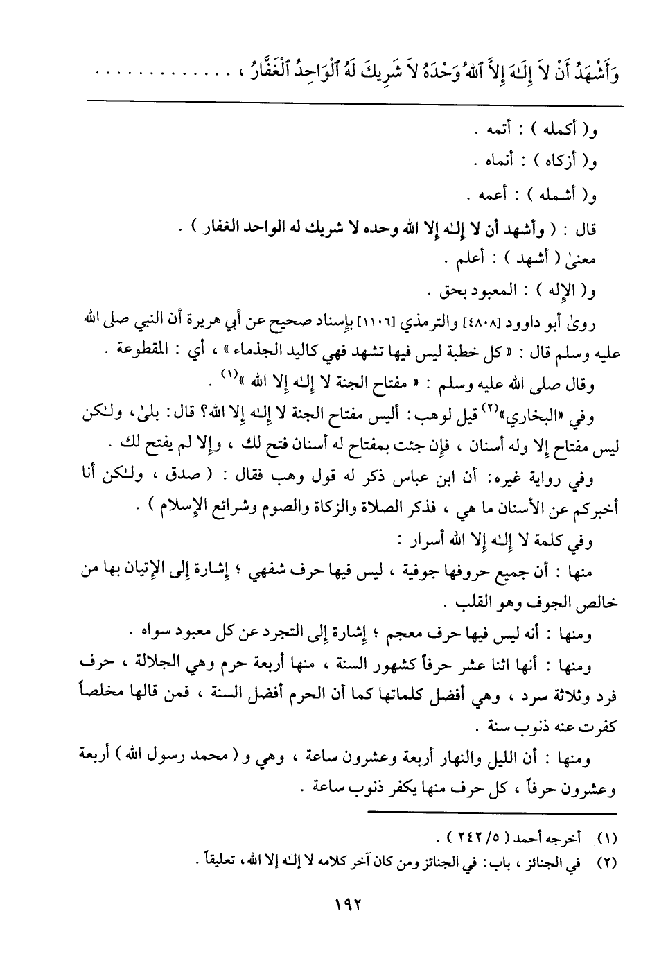 ومنها: أنها اثنا عشر حرفاً كشهور السنة، منها أربعة حرم وهي الجلالة، حرف فرد وثلاثة سرد، وهي أفضل كلماتها كما أن الحرم أفضل السنة، فمن قالها مخلصاً كفرت عنه ذنوب سنة.