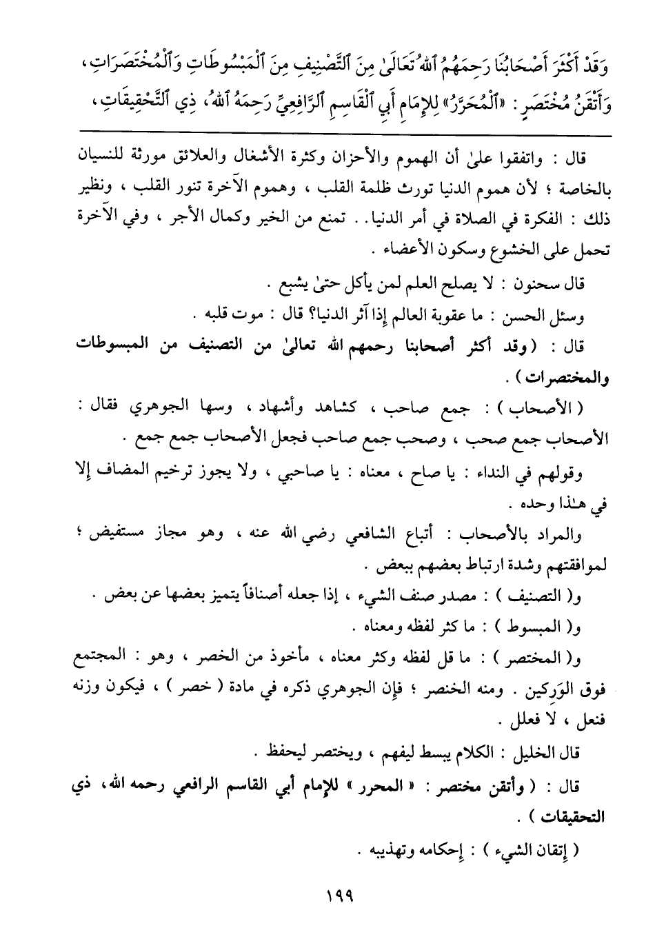 وَقَدْ أَكْثَرَ أَصْحَابُنَا رَحِمَهُمُ اللهُ تَعَالَى مِنَ التَّصْنِيفِ مِنَ الْمَبْسُوطَاتِ وَالْمُخْتَصَرَاتِ، وَأَتْقَنُ مُخْتَصَرٍ: (الْمُحَرَّرُ) لِلإِمَامِ أَبيِ الْقَاسِمِ الرَّافِعِيَّ رَحِمَهُ اللهُ، ذِي التَّحْقِيقَاتِ،