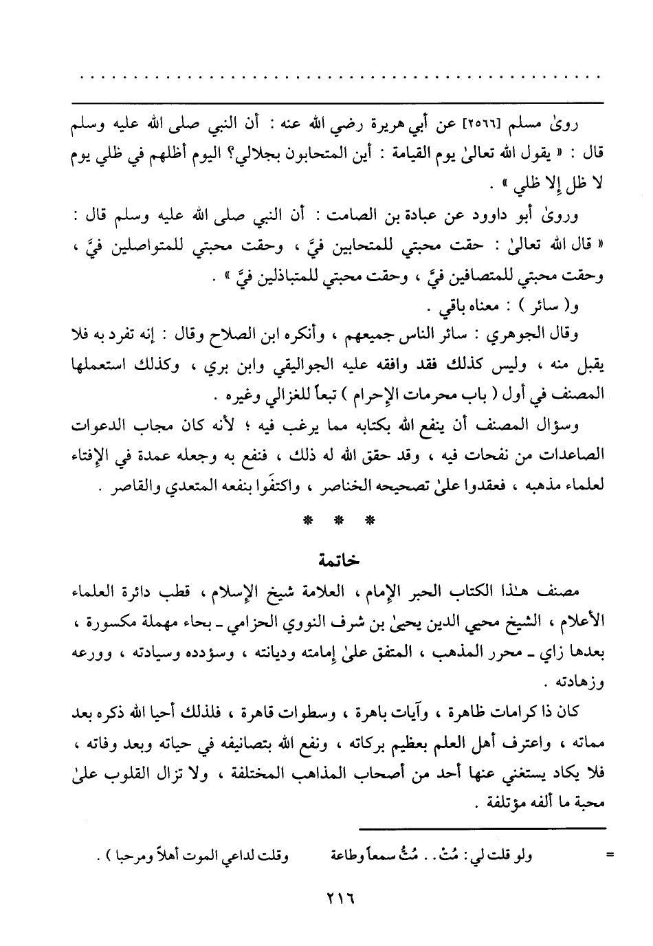 مصنف هذا الكتاب الحبر الإمام، العلامة شيخ الإسلام، قطب دائرة العلماء الأعلام، الشيخ محيي الدين يحيى بن شرف النووي الحزامي – بحاء مهملة مكسورة، بعدها زاي – محرر المذهب، المتفق على إمامته وديانته، وسؤدده وسيادته، وورعه وزهادته.
