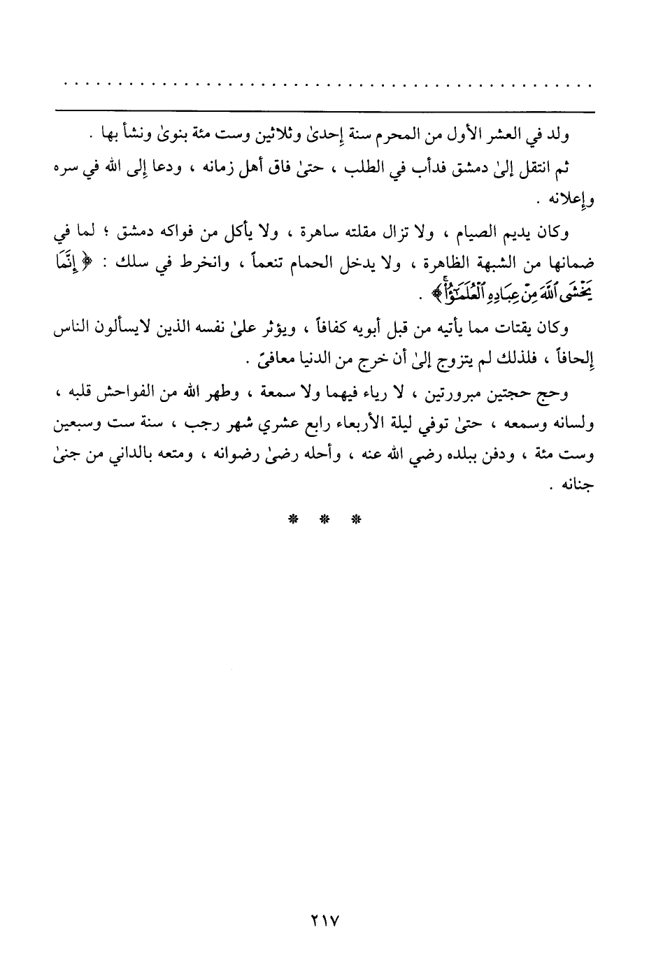 وكان يديم الصيام، ولا تزال مقلته ساهرة، ولا تأكل من فواكه دمشق؛ لما في ضمانها من الشبهة الظاهرة، ولا يدخل الحمام تنعماً، وانخرط في سلك: {إنَّمَا يَخْشَى اللَّهَ مِنْ عِبَادِهِ العُلَمَاءُ}.