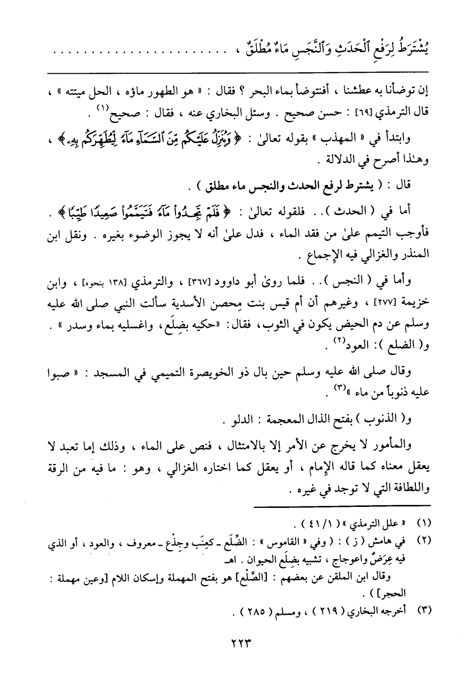 يُشْتَرَطُ لِرَفْعِ الْحَدَثِ وَالنَّجّسِ مَاءٌ مُطْلَقٌ،