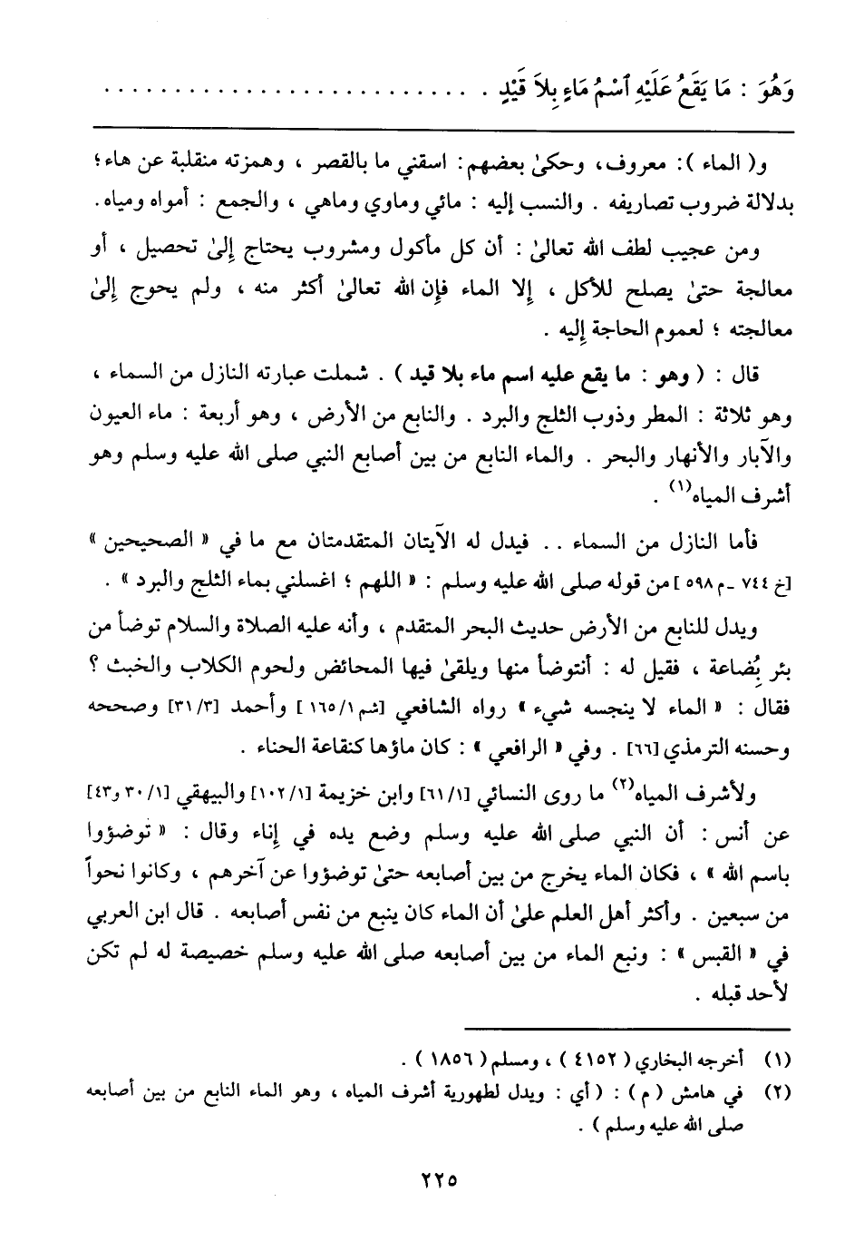 قال: (وهو: ما يقع عليه اسم ماء بلا قيد). شملت عبارته النازل من السماء، وهو ثلاثة: المطر وذوب الثلج والبرد. والنابع من الأرض، وهو أربعة: ماء العيون والآبار والأنهار والبحر. والماء النابع من بين أصابع النبي صلى الله عليه وسلم وهو أشرف المياه.