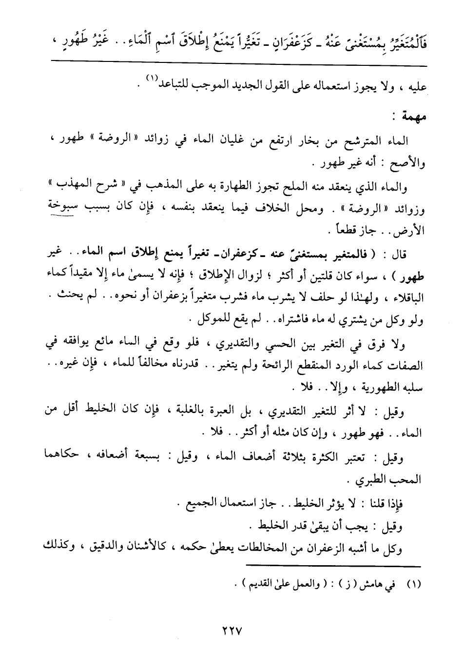 قال: (فالمتغير بمستغنى عنه – كزعفران – تغيراً يمنع إطلاق اسم الماء .. غير طهور)، سواء كان قلتين أو أكثر؛ لزوال الإطلاق؛ فإنه لا يسمى ماء إلا مقيداً كماء الباقلاء، ولهذا لو حلف لا يشرب ماء فشرب متغيراً بزعفران أو نحوه .. لم يحنث. ولو وكل من يشتري له ماء فاشتراه .. لم يقع للموكل.