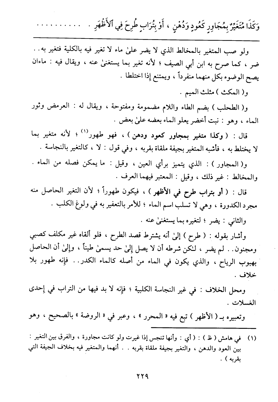 قال: (وكذا متغير بمجاور كعود ودهن) فهو طهور؛ لأنه متغير بما لا يختلط به، فأشبه المتغير بجيفة ملقاة بقربه، وفي قول: لا، كالتغير بالنجاسة.