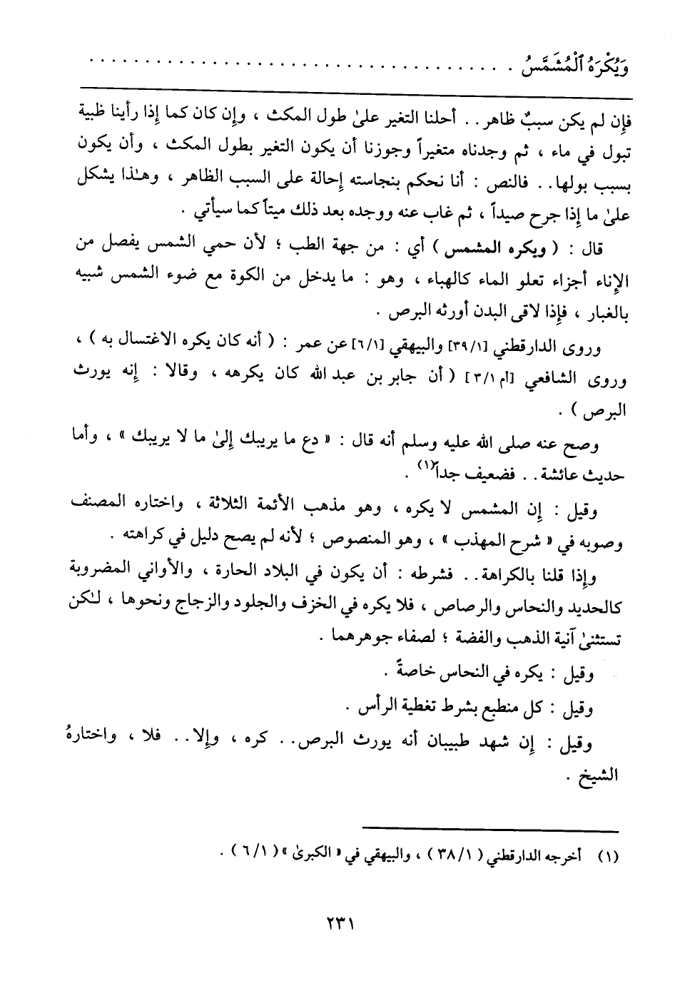 قال: (ويكره المشمس) أي: من جهة الطب؛ لأن حمي الشمس يفصل من الإناء أجزاء تعلو الماء كالهباء، وهو: ما يدخل من الكوة مع ضوء الشمس شبيه بالغبار، فإذا لاقى البدن أورثه البرص.