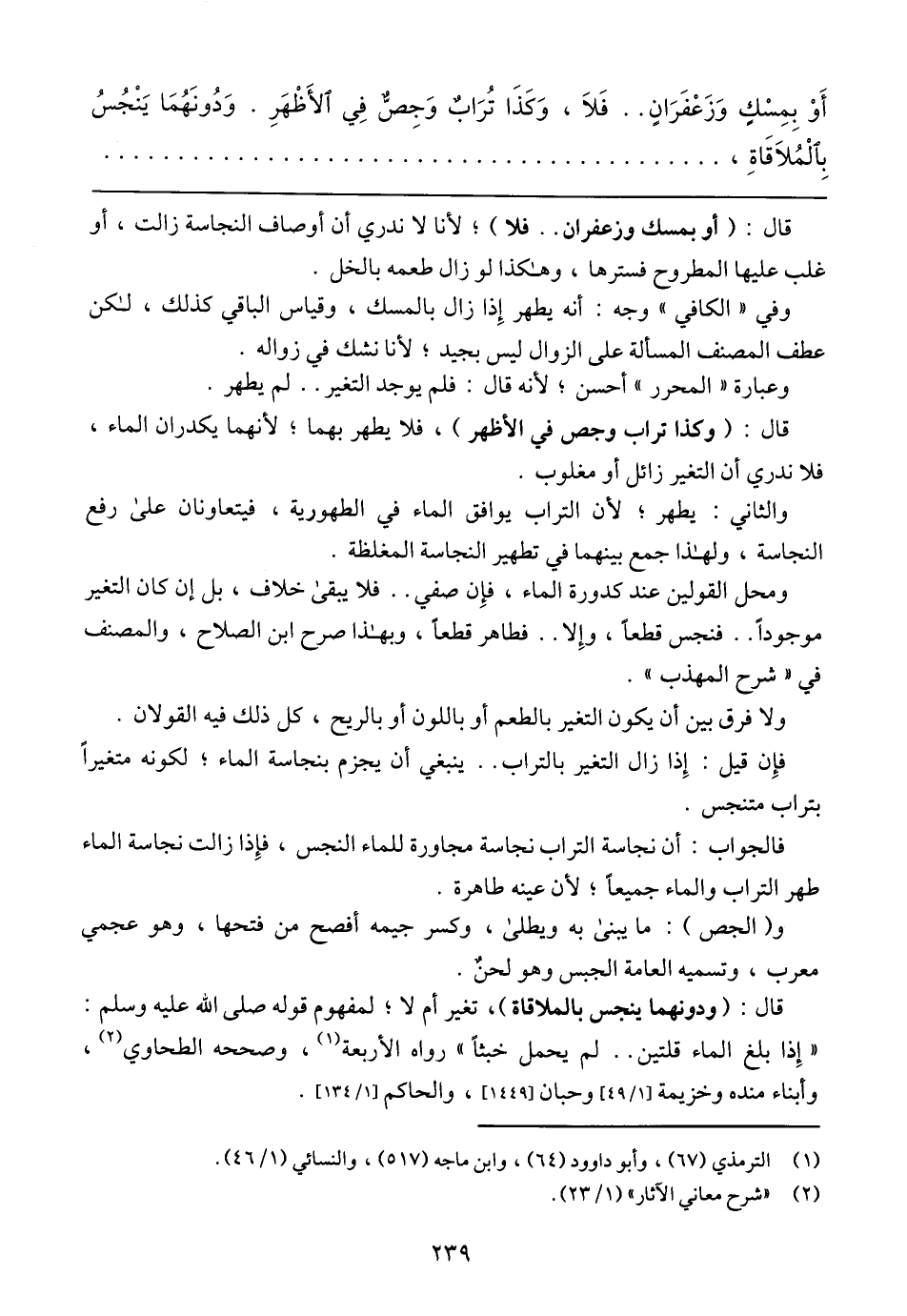 أَوْ بِمِسْكٍ وَزَعْفَرَانٍ .. فَلاَ، وَكَذا تُرَابٌ وَجِصٌّ فِي الأَظْهَرِ. وَدُونَهُمَا بَنْجُسُ بِالْمُلاَقَاةِ،
