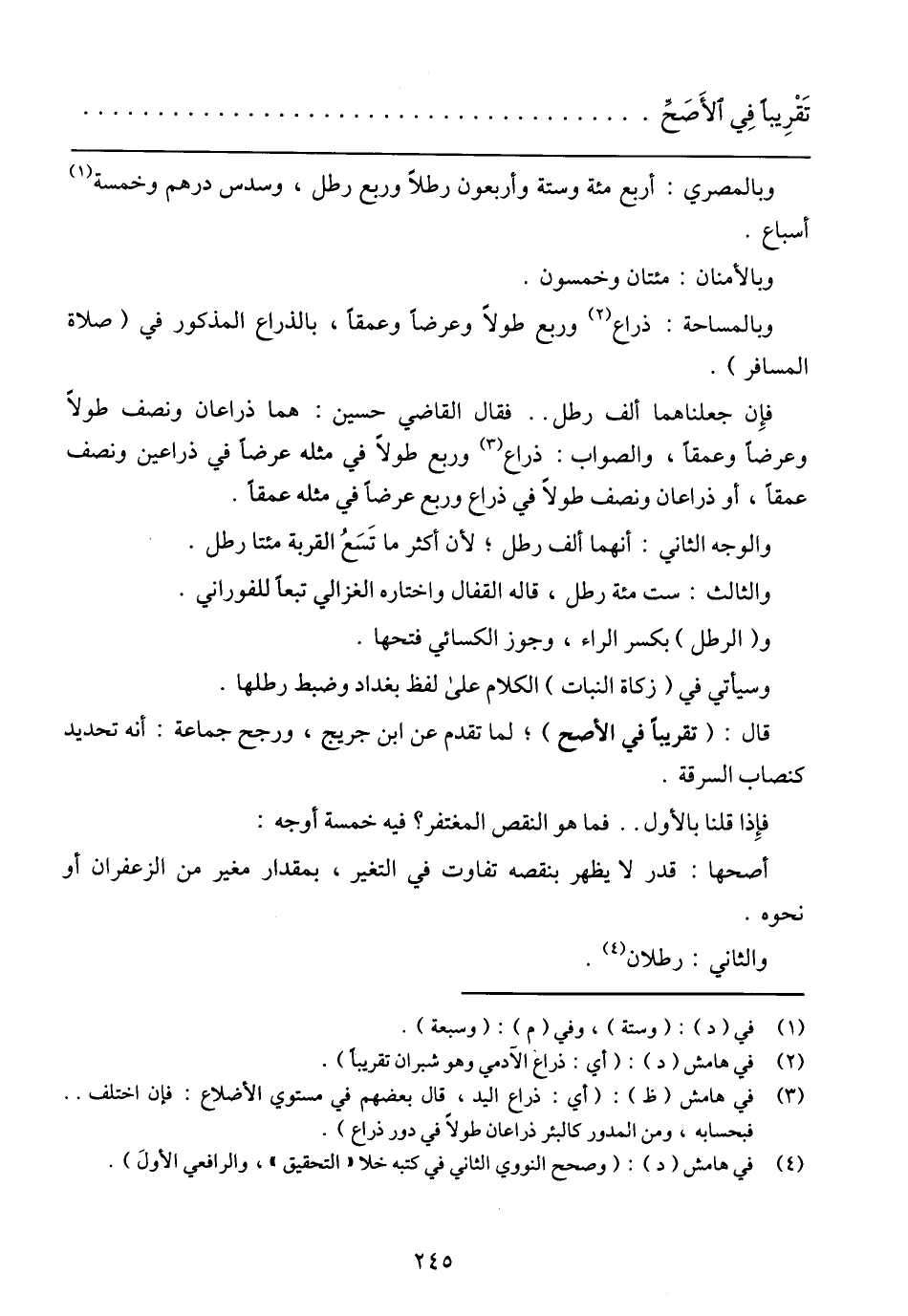 وبالمساحة: ذراع وربع طولاً وعرضاً وعمقاً، بالذراع المذكور في (صلاة المسافر).