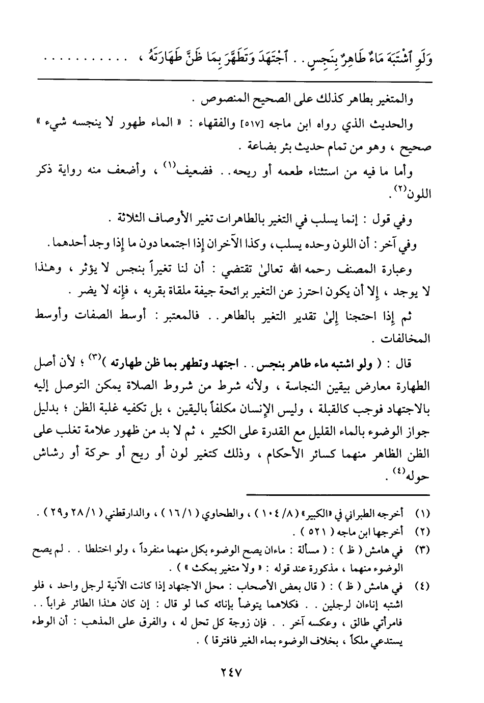 والحديث الذي رواه ابن ماجه [517] والفقهاء: (الماء طهور لا ينجسه شيء) صحيح، وهو من تمام حديث بئر بضاعة.