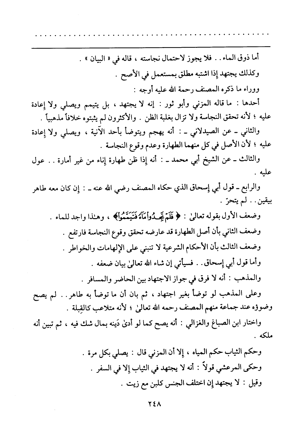 أحدها: ما قاله المزني وأبو ثور: إنه لا يجتهد، بل يتيمم ويصلي ولا إعادة عليه؛ لأنه تحقق النجاسة ولا تزال بغلبة الظن. والأكثرون لم يثبتوه خلافاً مذهبياً.