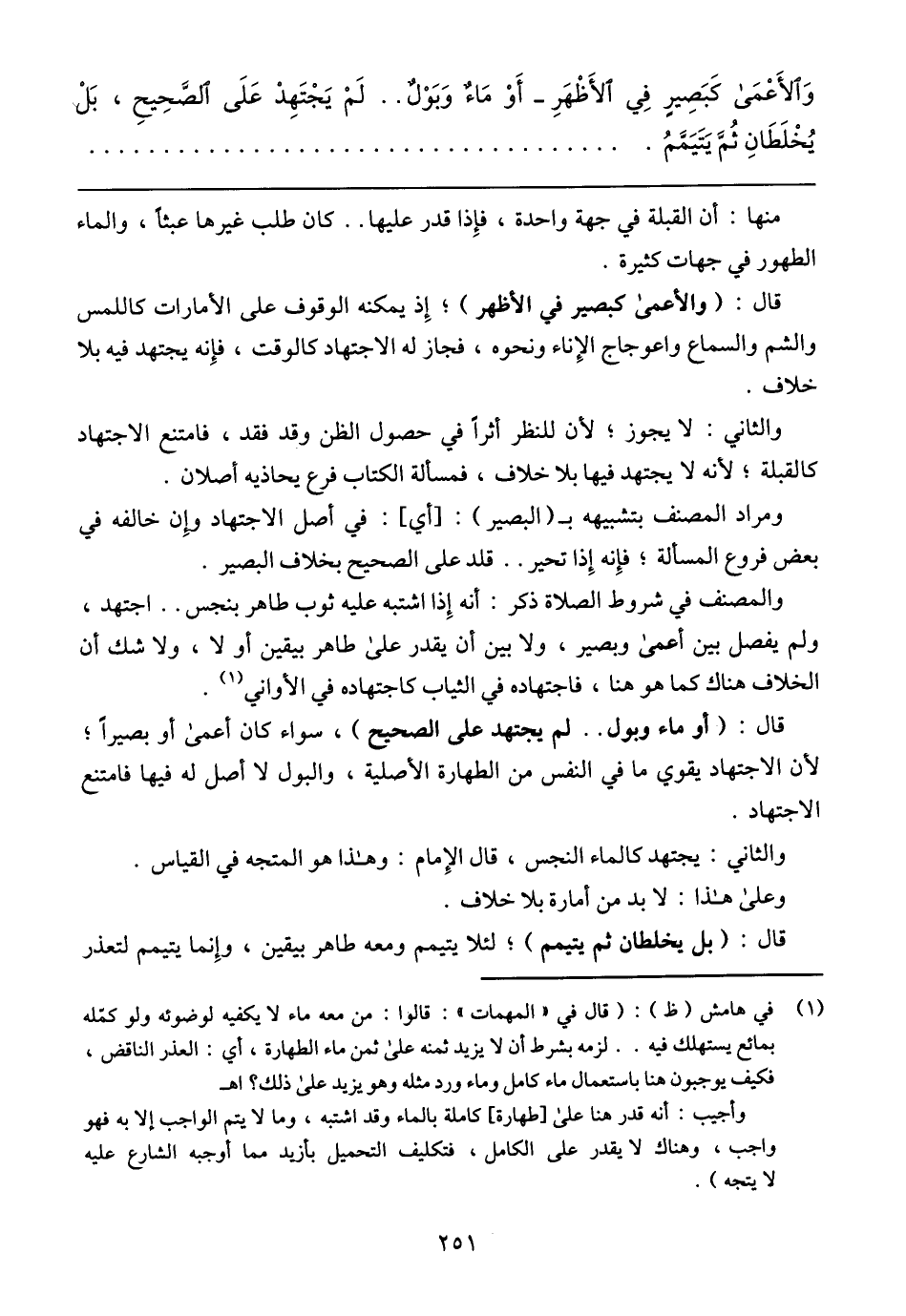وَاَلأَعْمَى كَبَصِيرٍ فِي اَلأَظْهَرِ – أَوْ مَاءٌ وَبَوْلٌ .. لَمْ يَجْتَهِدْ عَلَى اَلصَّحِيحِ، بَلْ يُخْلَطَانِ ثُمَّ يَتَيَمَّمُ.