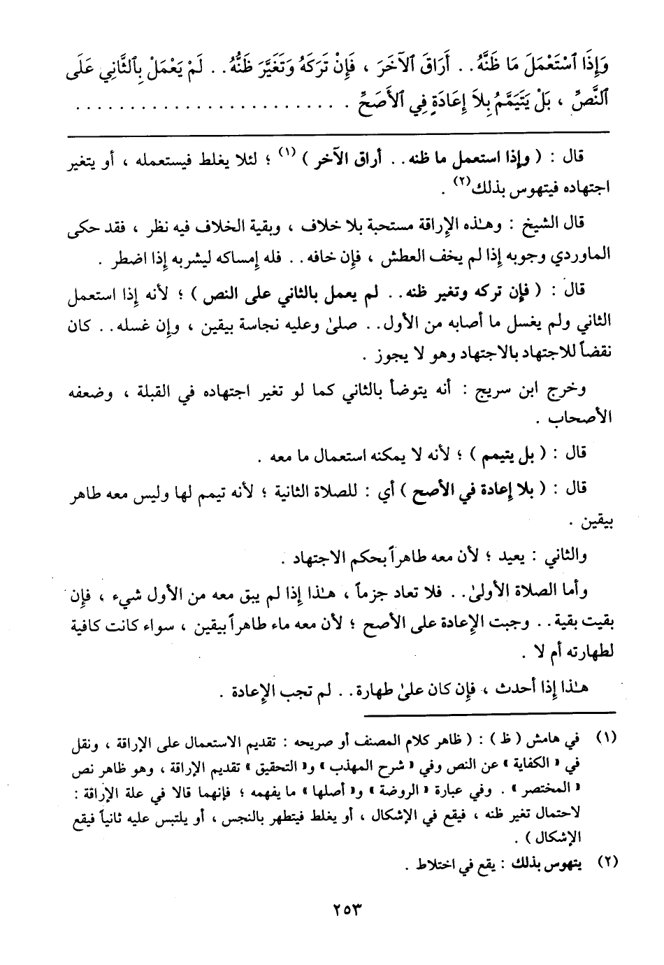 وَإِذَا اَسْتَعْمَلَ مَا ظَنَّهُ .. أَرَاقَ اَلآخَرَ، فَإِنْ تَرَكَهُ وَتَغَيَّرَ ظَنُّهُ .. لَمْ يَعْمَلْ بِاَلثَّانِي عَلَى اَلنَّصَّ، بَلْ يَتَيَمَّمُ بِلاَ إعَادَةٍ فِي اَلأَصَحَّ.