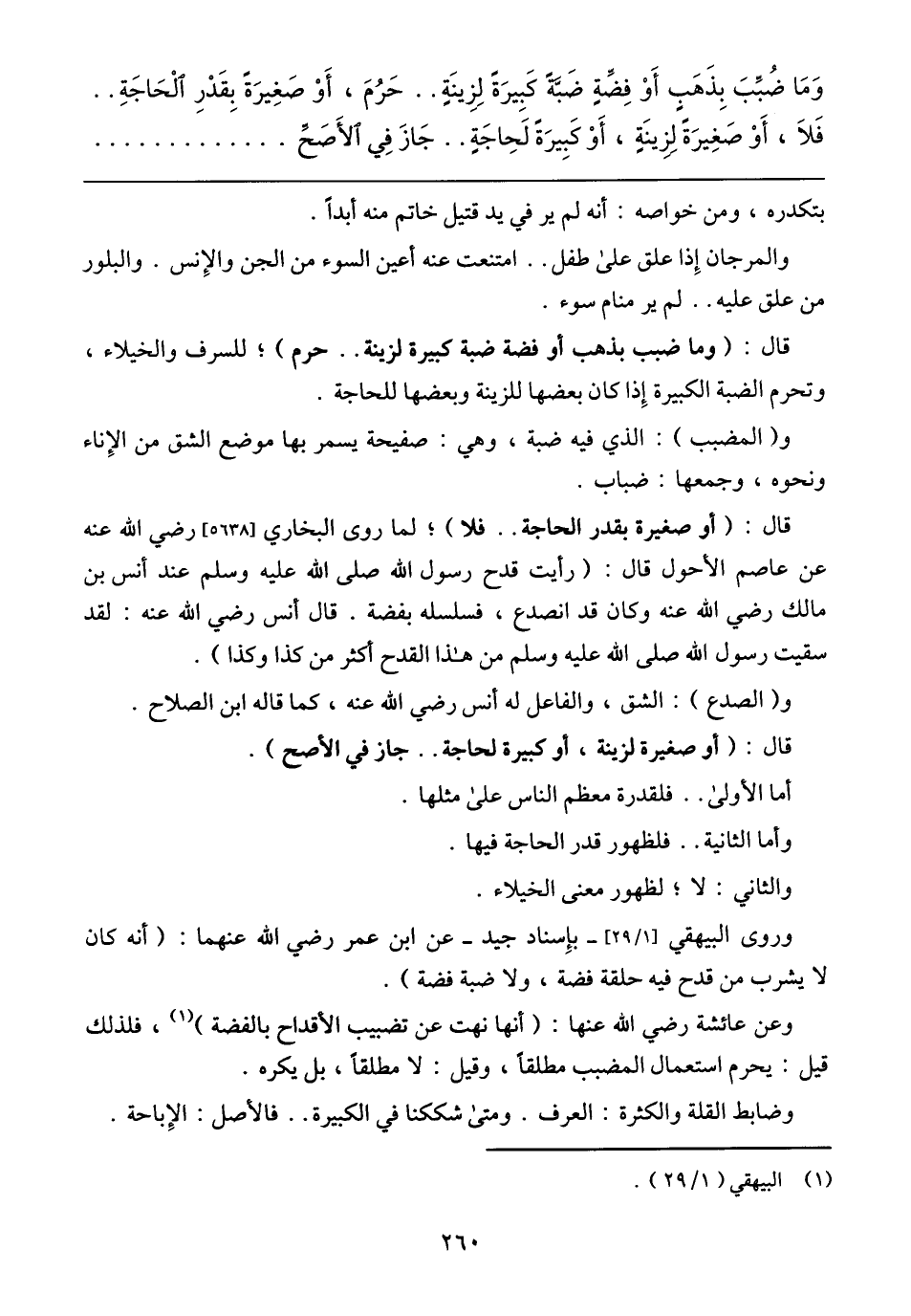 وروى البيهقي [1/ 29] – بإسناد جيد – عن ابن عمر رضي الله عنهما: (أنه كان لا يشرب من قدح فيه حلقة فضة، ولا ضبة فضة).