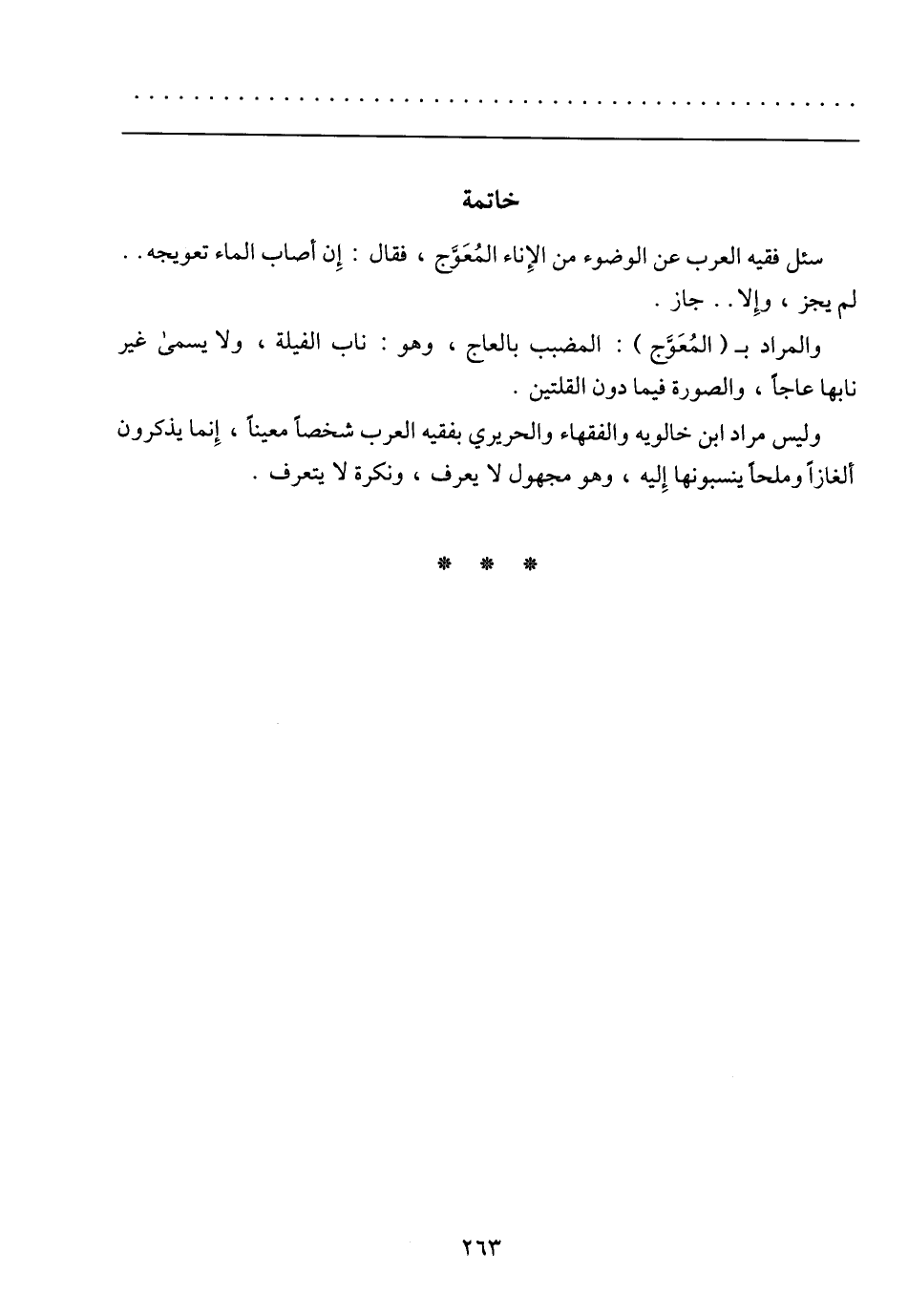 سئل فقيه العرب عن الوضوء من الإناء المعوج، فقال: إن أصاب الماء تعويجه .. لم يجز، وإلا .. جاز.