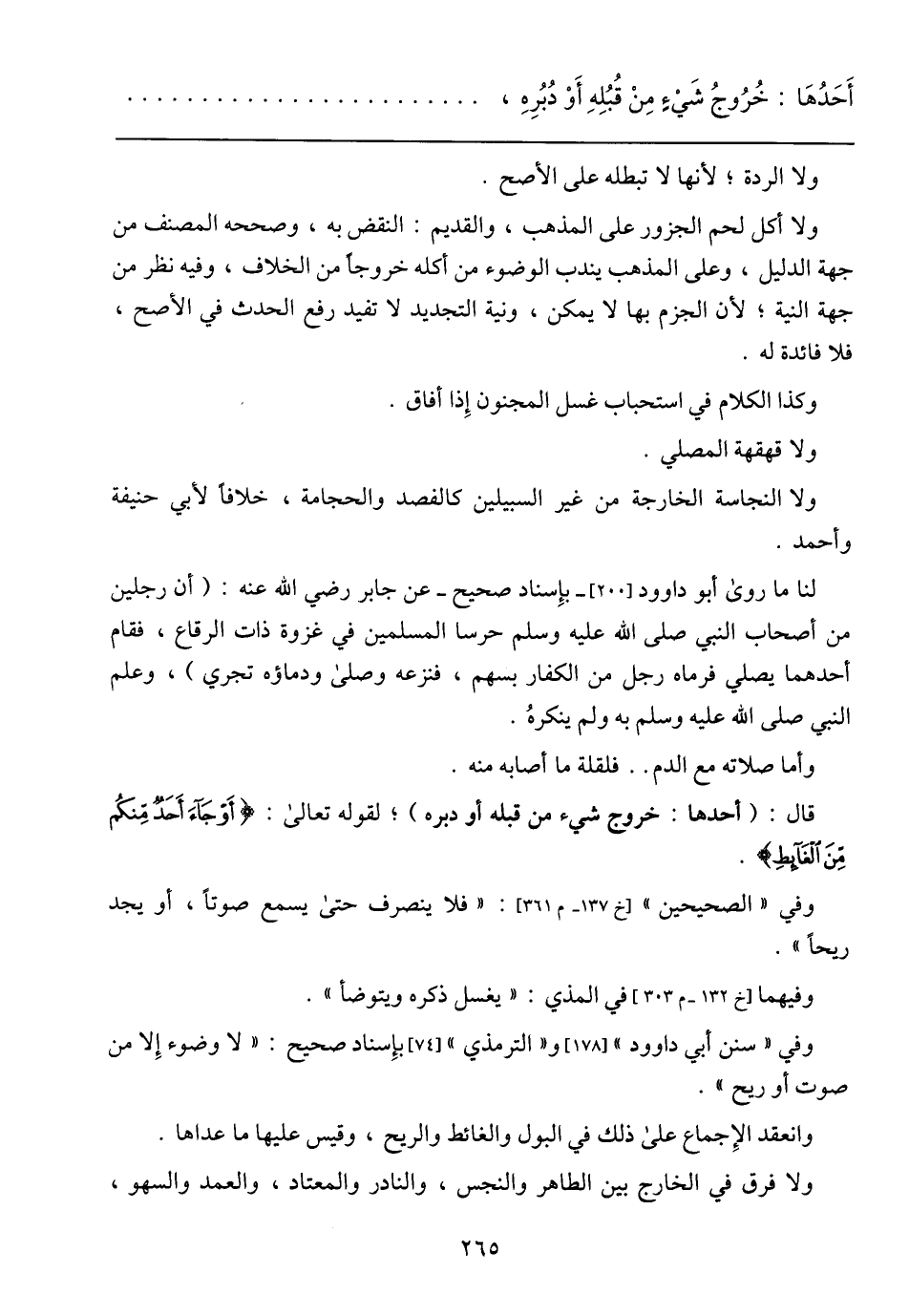 قال: (أحدها: خروج شيء من قبله أو دبره)؛ لقوله تعالى: {أَوْ جَاءَ أَحَدٌ مِّنكُم مِّنَ الغَائِطِ}.