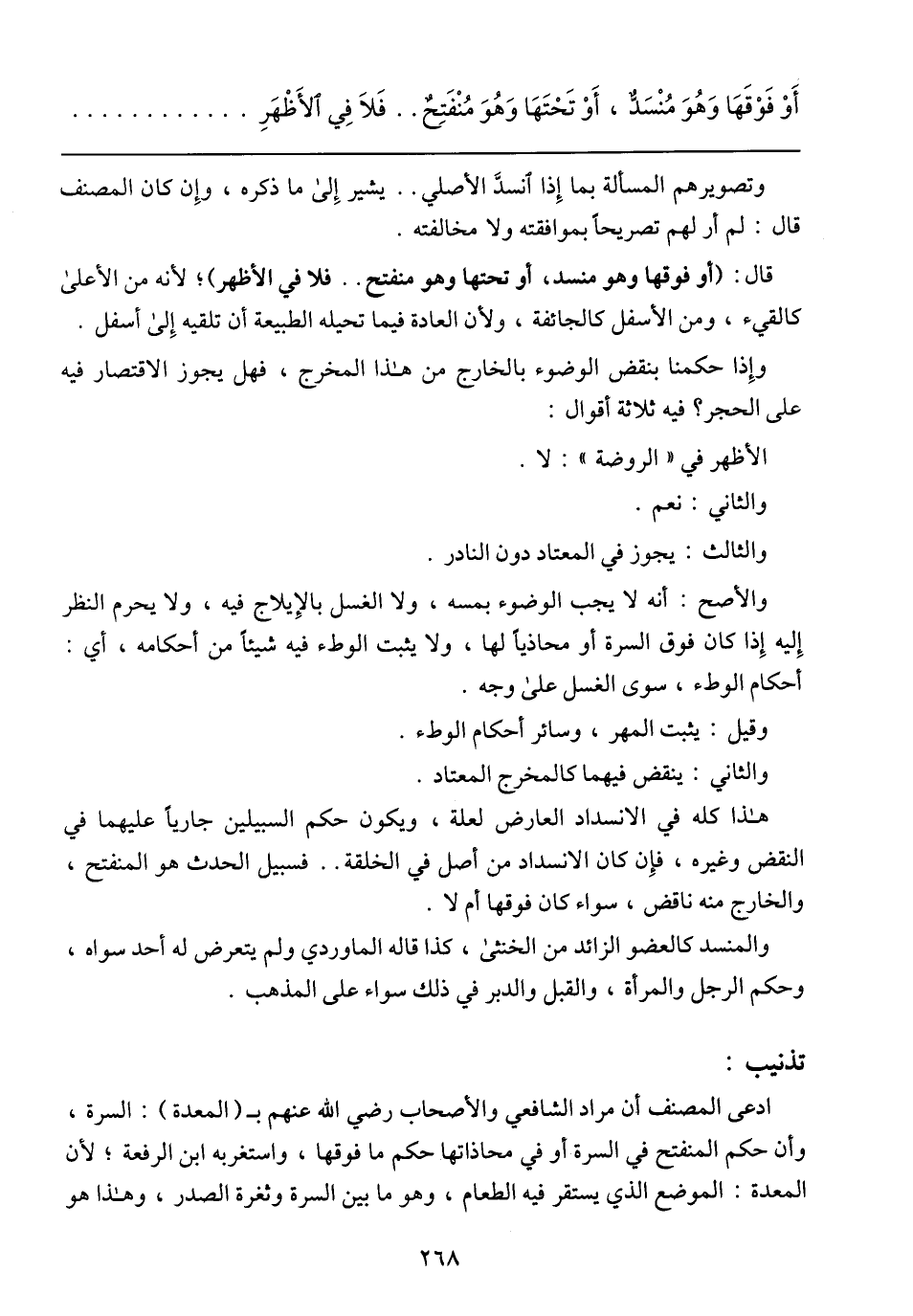 هذا كله في الانسداد العارض لعلة، ويكون حكم السبيلين جارياً عليهما في النقض وغيره، فإن كان الانسداد من أصل في الخلقة .. فسبيل الحدث هو المنفتح، والخارج منه ناقض، سواء كان فوقها أم لا.