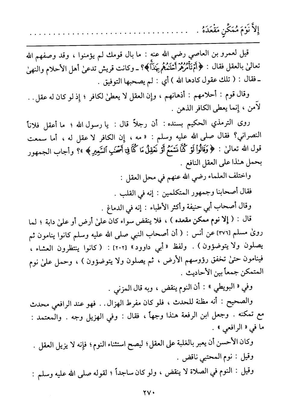 قال: (إلا نوم ممكن مقعده)، فلا ينقض سواء كان على أرض أو على دابة؛ لما روى مسلم [376] عن أنس: (أن أصحاب النبي صلى الله عليه وسلم كانوا ينامون ثم يصلون ولا يتوضؤون). ولفظ (أبي داوود) [202]: (كانوا ينتظرون العشاء، فينامون حتى تخفق رؤوسهم الأرض، ثم يصلون ولا يتضؤون)، وحمل على نوم المتمكن جمعاً بين الأحاديث.